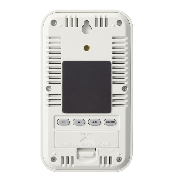 | 備考 | 【測定範囲】 温度:-5.0〜50.0度 湿度:20〜95% 【表示単位】 温度:0.1度 湿度:1% 【表示内容】 ・温度、湿度:3段階の快適レベル表示 ・過去の最高・最低温湿度 ・時計:12/24時間表示 ・30秒アラーム ・カレンダー:日付、曜日表示 |