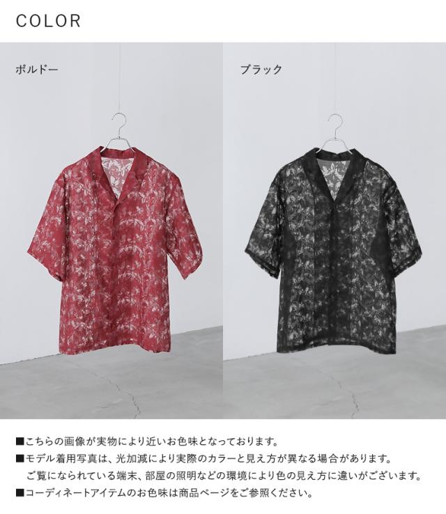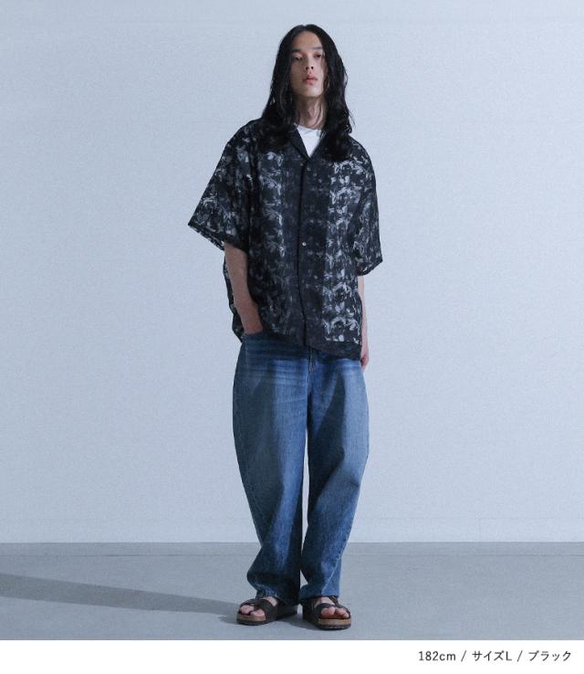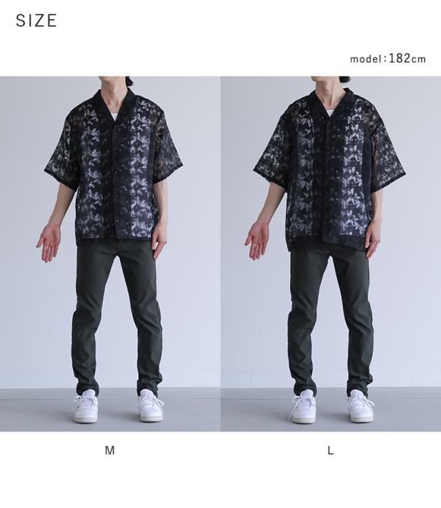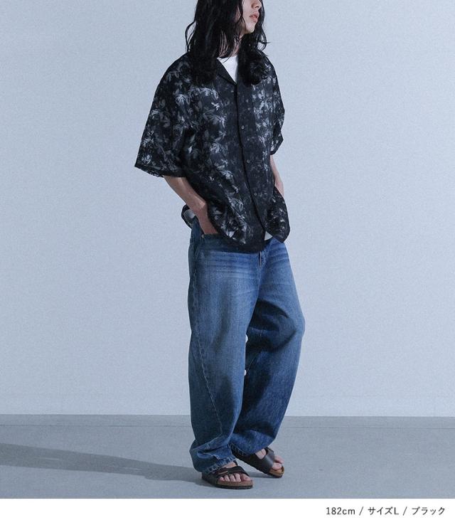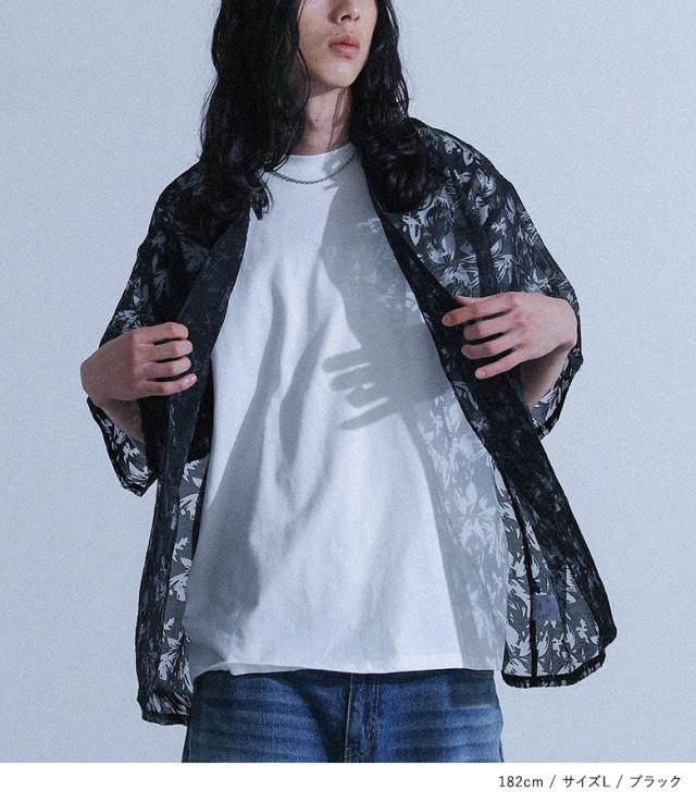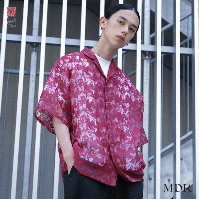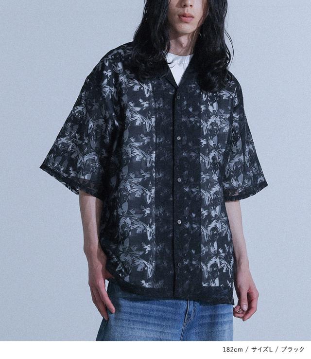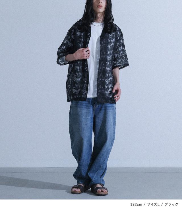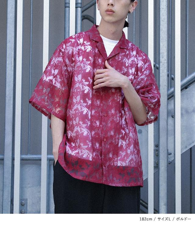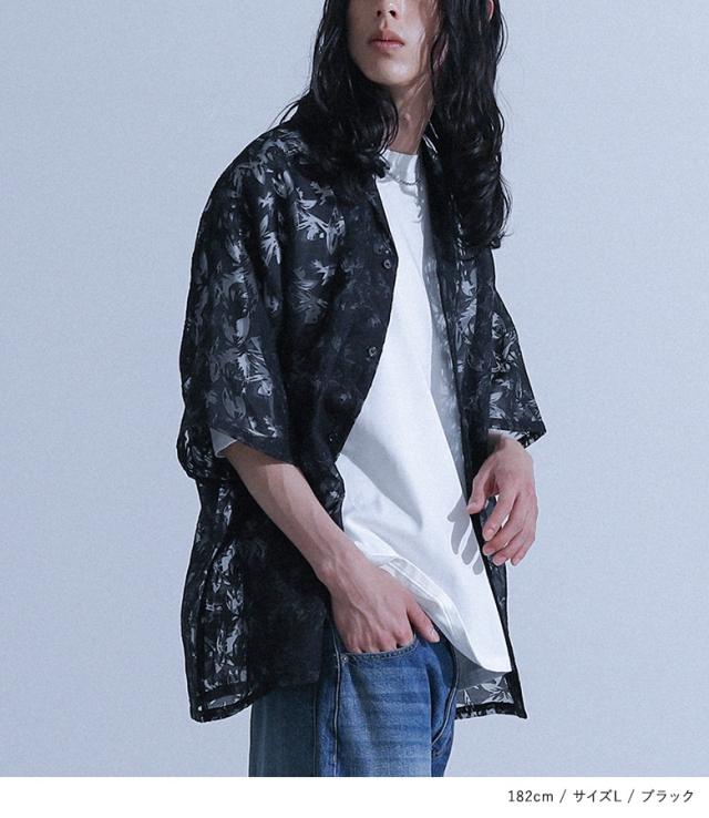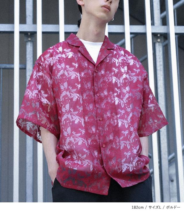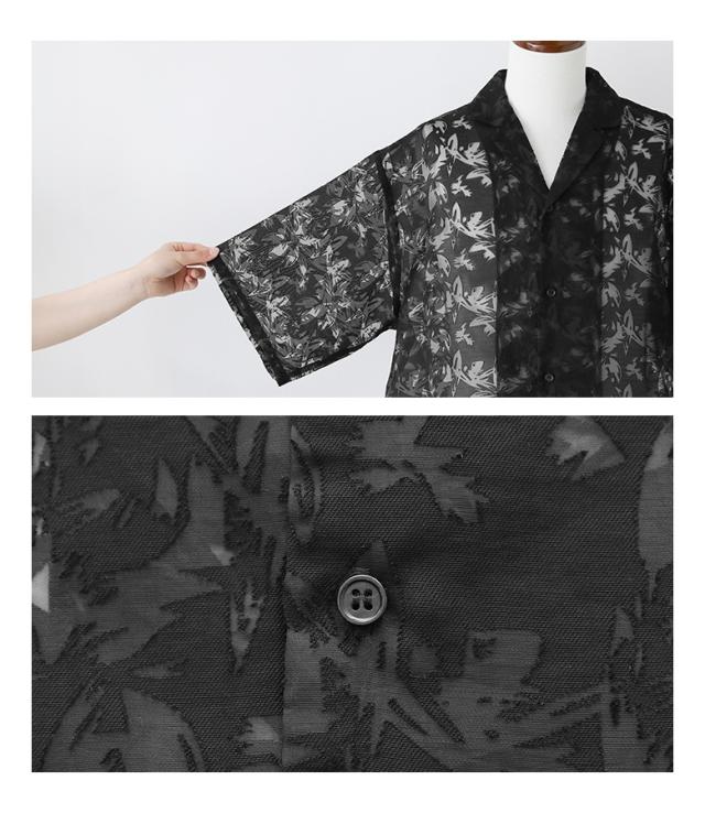 【感謝価格】『MDRシアージャカードシャツ』※メール便可※【10】[シャツ メンズ トップス 半袖 カジュアルシャツ 羽織 シアー 透け感 リーフ柄 ジャカード オープンカラー ボックスシルエット レイヤード 重ね着 春 夏]