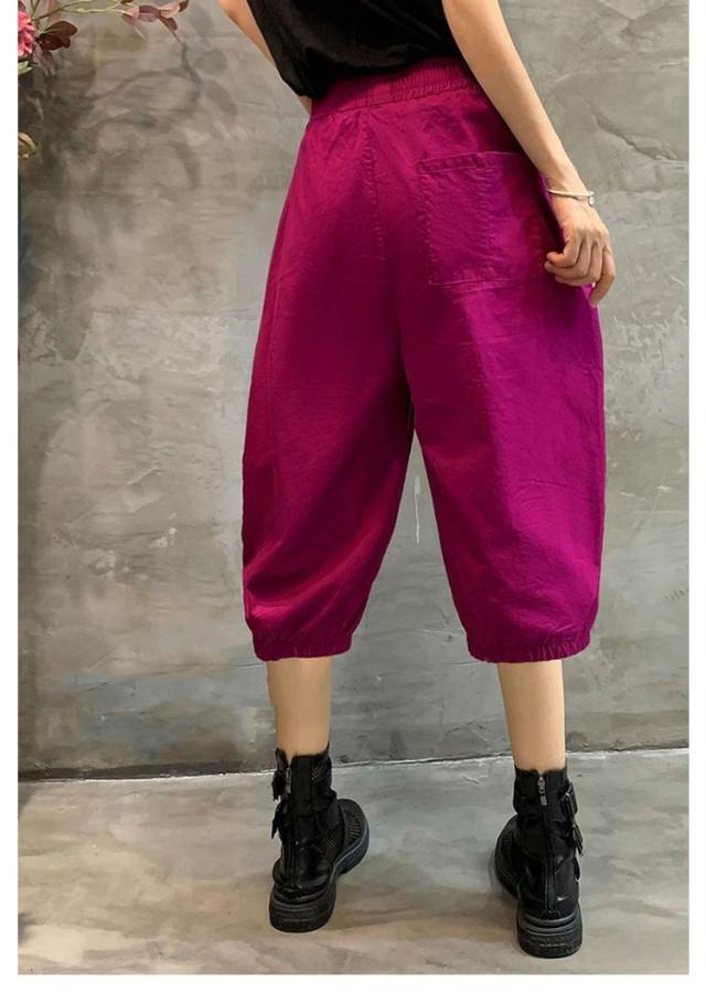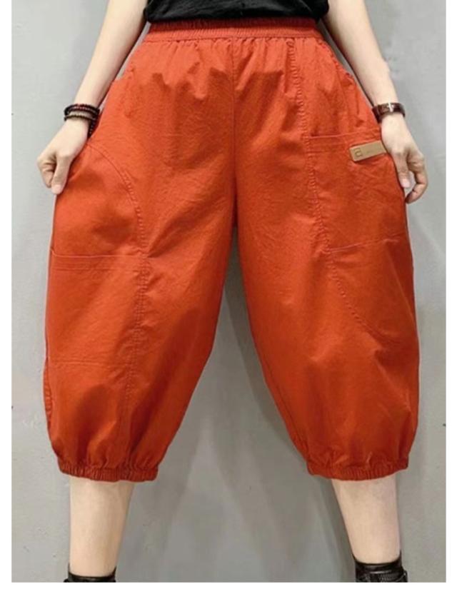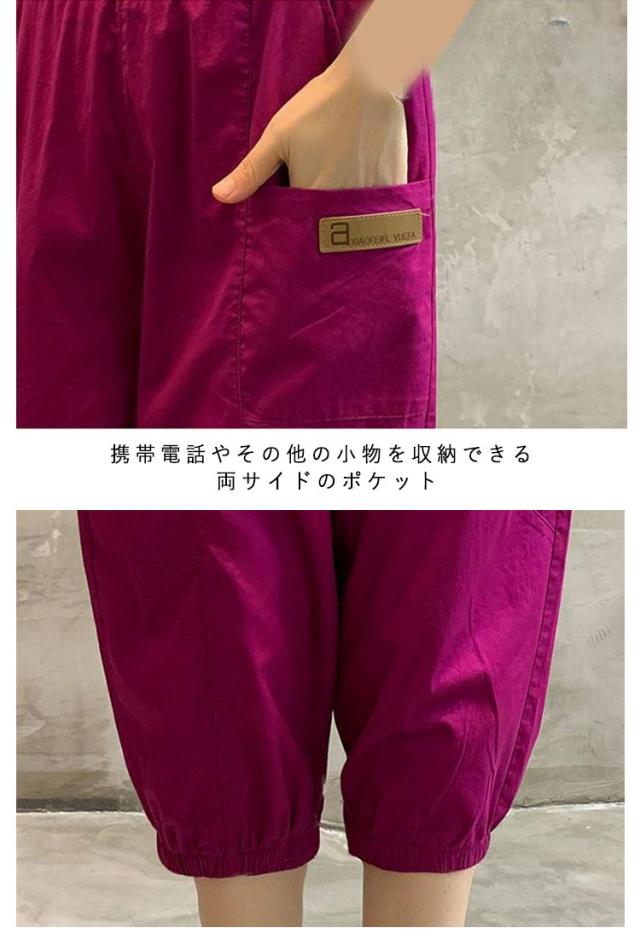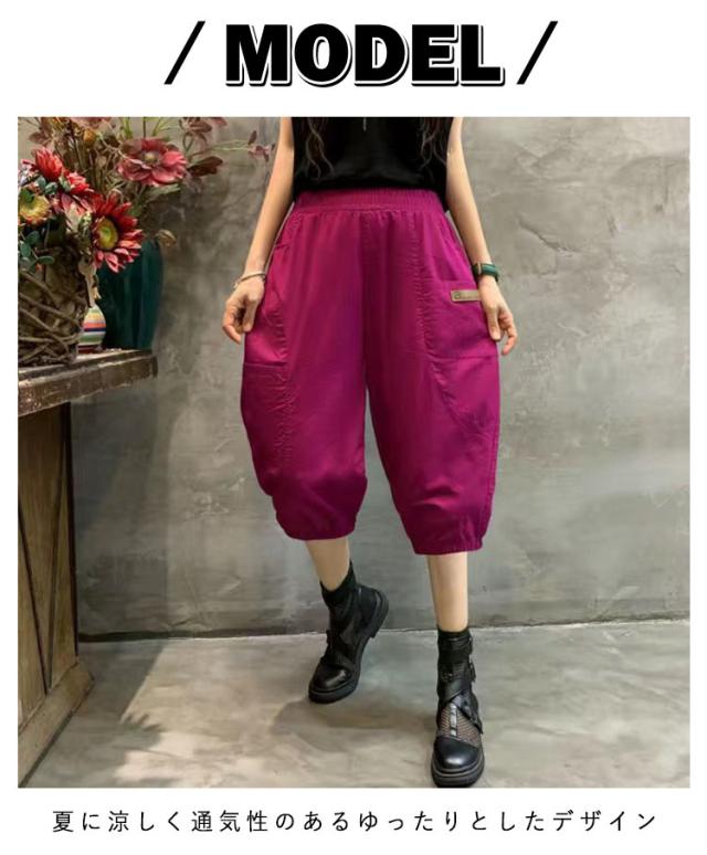 | シンプルで快適なレディース5分丈バルーンパンツ 携帯電話やその他の小物を収納できる両サイドのポケット 夏に涼しく通気性のあるゆったりとしたデザイン ウエストゴムで着脱便利 | |