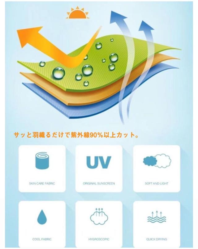 | ひんやり接触冷感と通気性のいいメッシュでさらっとした着心地。 サッと羽織るだけで紫外線90%以上カット。 強い日差しからフェイスを守る 取り外し可能な日焼け防止つばデザイン 調整可能な紐を付属し、突然の風にも負けない 口元を覆えるのでマスク代わりにも。 指穴付きの袖口デザインで手の甲・手のひらまでしっかりとカバー。 汗をかいてもすばやく吸い上げ拡散・蒸発 ドライ機能と抜群の通気性で長時間の着用でもさらっと快適に。 | |