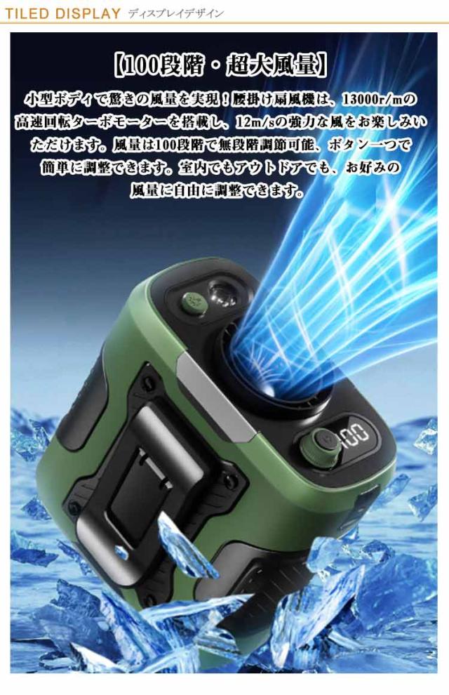 | 腰掛け・首掛け・手持ち・卓上の4WAYで使える多機能ウエスト扇風機。【瞬間冷却-18℃】 【4WAY多機能】一台でシーンに応じた使い方が可能です。腰掛ければ衣類の中を涼しく、首にかければやさしい風を感じられます。手に持って自由に風をあびたり、卓上に置いて自宅やオフィスで快適に過ごしたり、さまざまな場面で活躍します。 【小型・超軽量】ウエスト扇風機本体わずか約338gの軽さで、ウエストや首に取り付けても負担にならず、快適にお使いいただけます。手のひらサイズのコンパクト設計で、外出時や屋外作業にもぴったり。暑い日でも快適に過ごせます! 【100段階・超大風量】小型ボディで驚きの風量を実現!腰掛け扇風機は、13000r/mの高速回転ターボモーターを搭載し、12m/sの強力な風をお楽しみいただけます。風量は100段階で無段階調節可能、ボタン一つで簡単に調整できます。室内でもアウトドアでも、お好みの風量に自由に調整できます。 【最大約29時間連続使用】ウエストファンは6000mAhの大容量バッテリーを内蔵しており、一度の充電で最大約24時間連続使用が可能。頻繁な充電の手間がなく、外出先や長時間の使用にも安心です。さらに、Type-Cポートによる急速充電にも対応しており、短時間で効率的に充電が完了します。(※使用時間は使用環境や設定により異なります。) 【風量・残量LED画面表示】この腰掛けファンは、風量段階とバッテリー残量を液晶ディスプレイに数字でわかりやすく表示。電池が少なくなった場合も画面ですぐに把握できるため、充電のタイミングを逃さず安心してご使用いただけます。 【懐中電灯機能付き】このベルトファンには便利な懐中電灯機能が搭載されています。点灯モードは「常時点灯」と「SOS点滅」の2種類から選択可能。夜間の屋外作業やキャンプ、防災グッズとしての備え、停電時の緊急ライトなど、さまざまなシーンで大活躍です。 | |