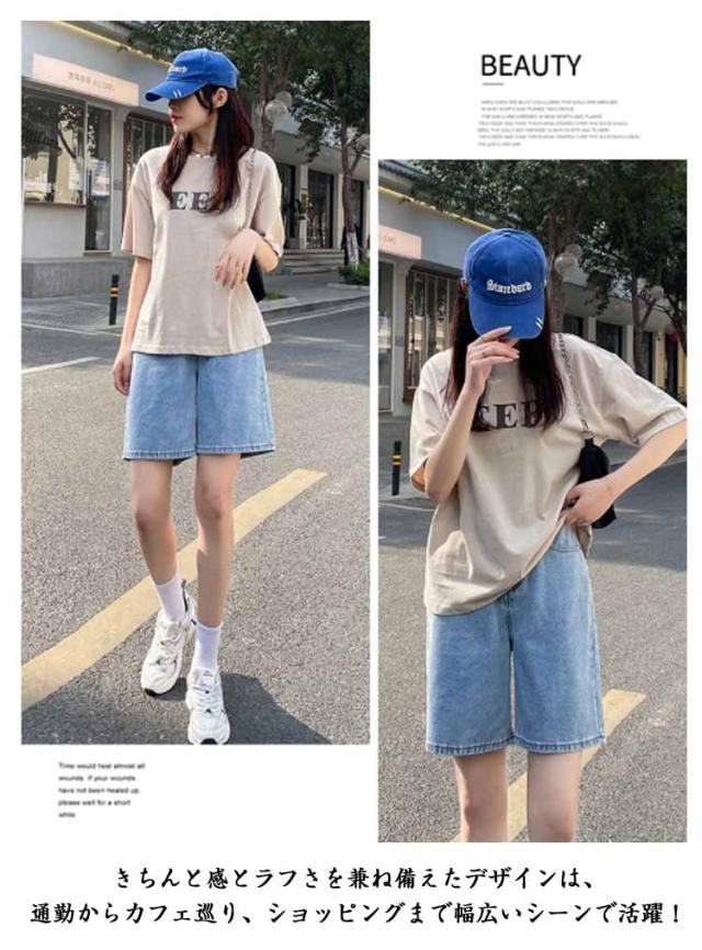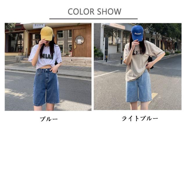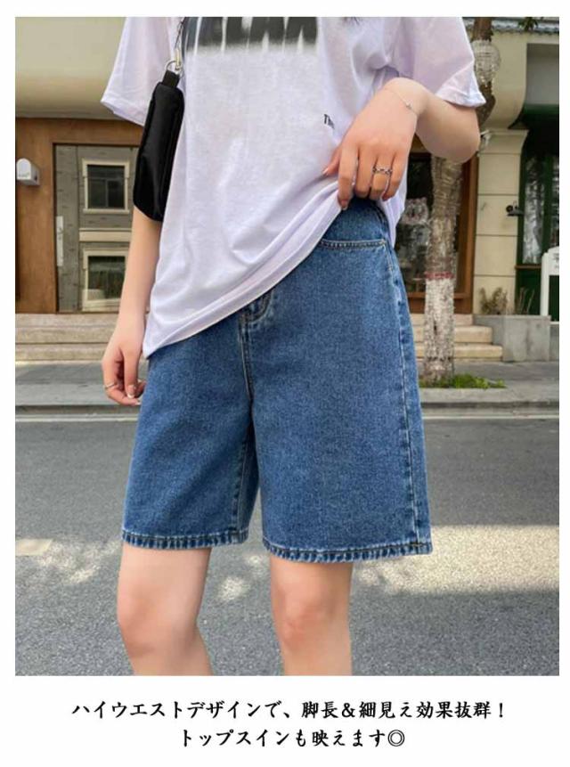 ハイウエスト 学生 薄手 デニムパンツ Aラインパンツ ショートパンツ ゆったり ワイドパンツ 大きいサイズ ストレートパンツ レディース 五分丈 ウエストゴム カジュアルパンツ 通勤 おしゃれ デニムパンツ シンプル ボトムス 無地