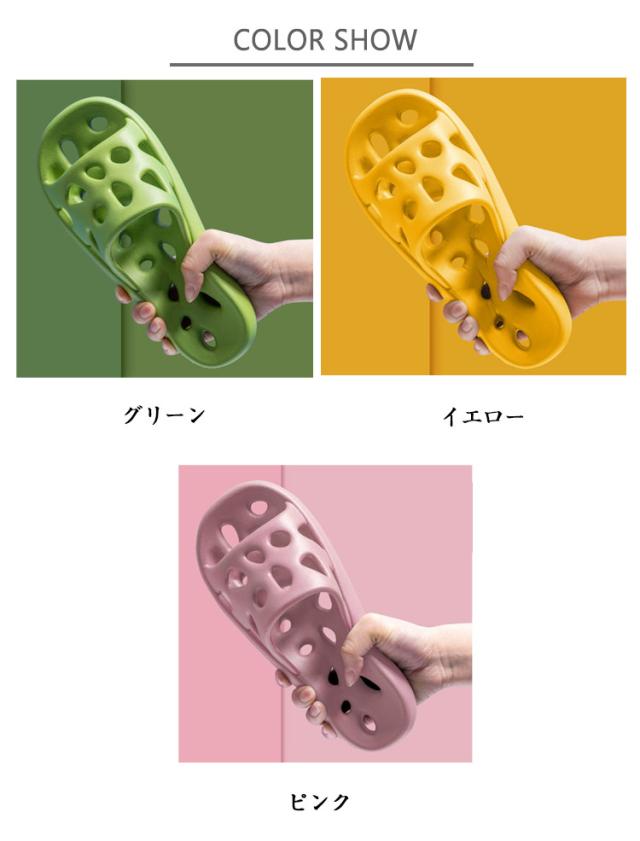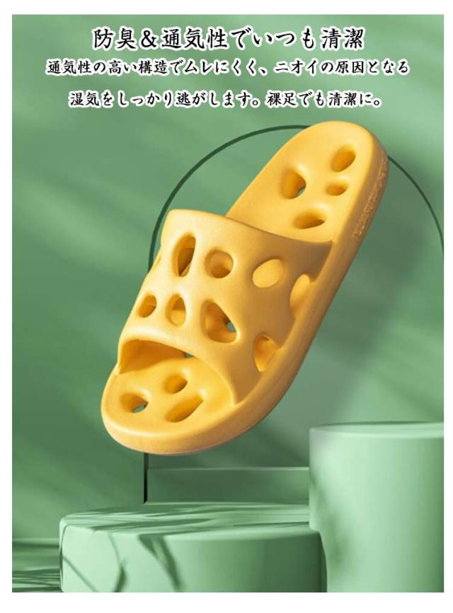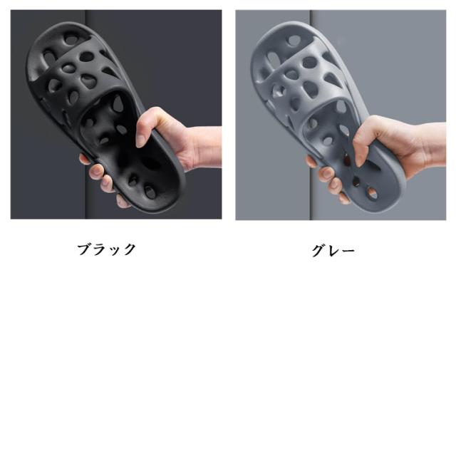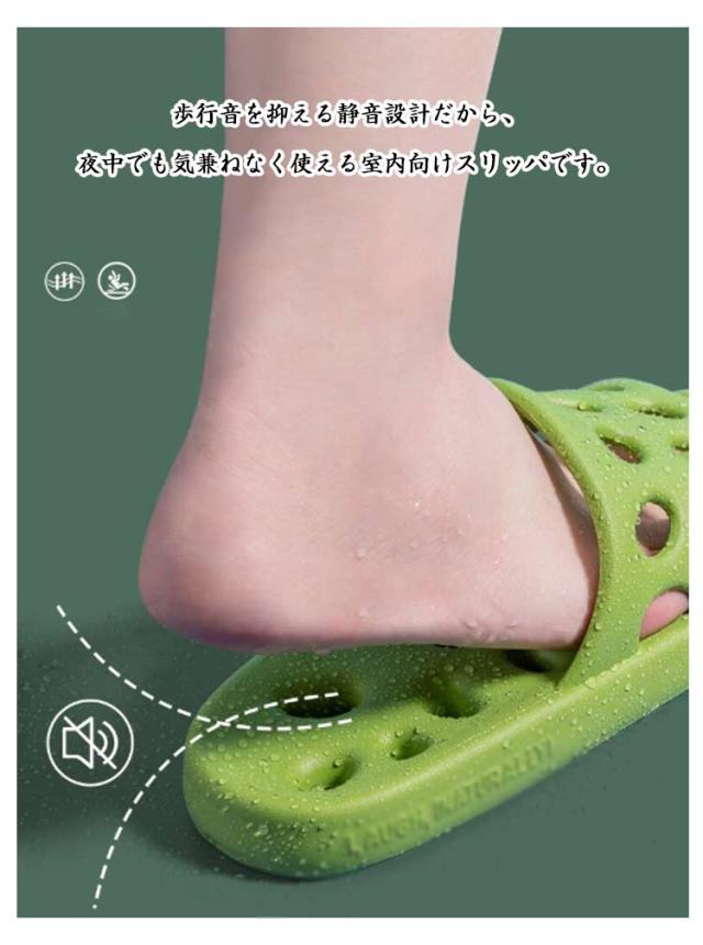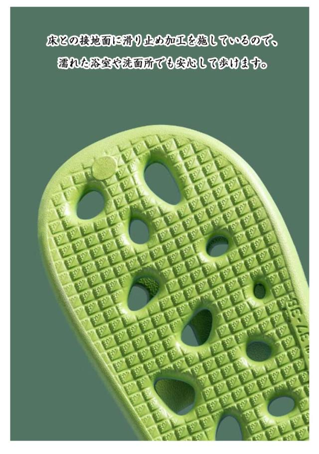 | ソールもアッパーも全面通気設計!お風呂上がりや夏の室内履きにぴったりです。 高弾力EVA素材を使用し、ふわふわで足裏にやさしい感触。長時間履いても疲れにくい設計です。 床との接地面に滑り止め加工を施しているので、濡れた浴室や洗面所でも安心して歩けます。 防臭&通気性でいつも清潔 通気性の高い構造でムレにくく、ニオイの原因となる湿気をしっかり逃がします。裸足でも清潔に。 シンプルデザインでペア使いにも◎ 男女兼用で使えるユニセックスデザイン。お揃いにしやすいカラー展開で、カップルや夫婦にもおすすめ。 歩行音を抑える静音設計だから、夜中でも気兼ねなく使える室内向けスリッパです。 | |