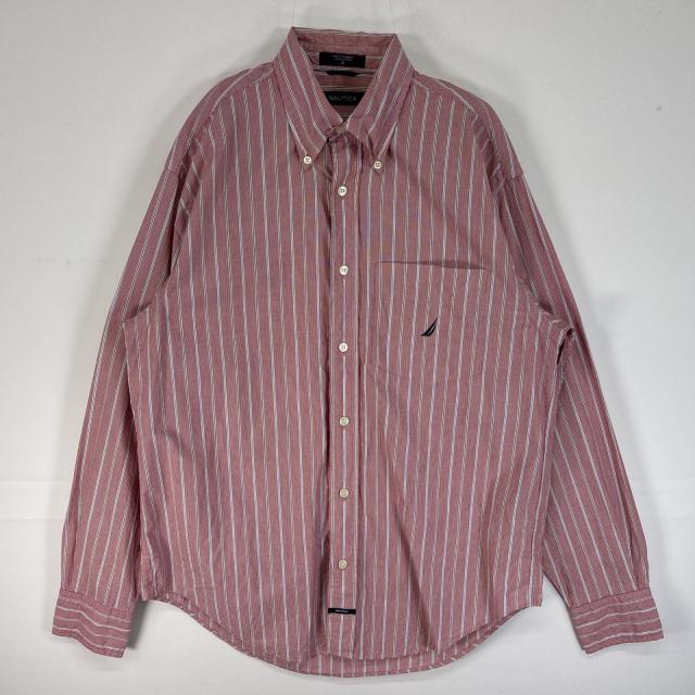 古着 ノーティカ NAUTICA 長袖シャツ ストライプ ロゴ 刺繍 ボタンダウン 薄手 S レッド マルチカラー メンズ