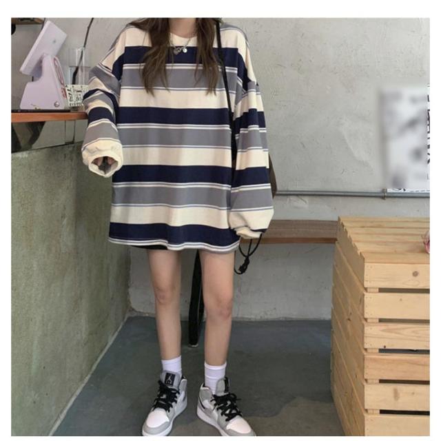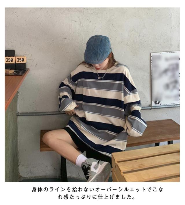 ロンT レディース クルーネック オーバーサイズ ビッグシルエット ラウンドネック tシャツ 長袖 ゆったり 秋 春 トップス 部屋着 韓国ファッション 大人 おしゃれ カットソー 丸首 ルームウェア ロングTシャツ 大きいサイズ ボーダー 送料無料
