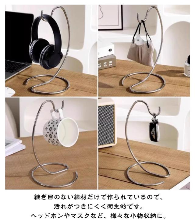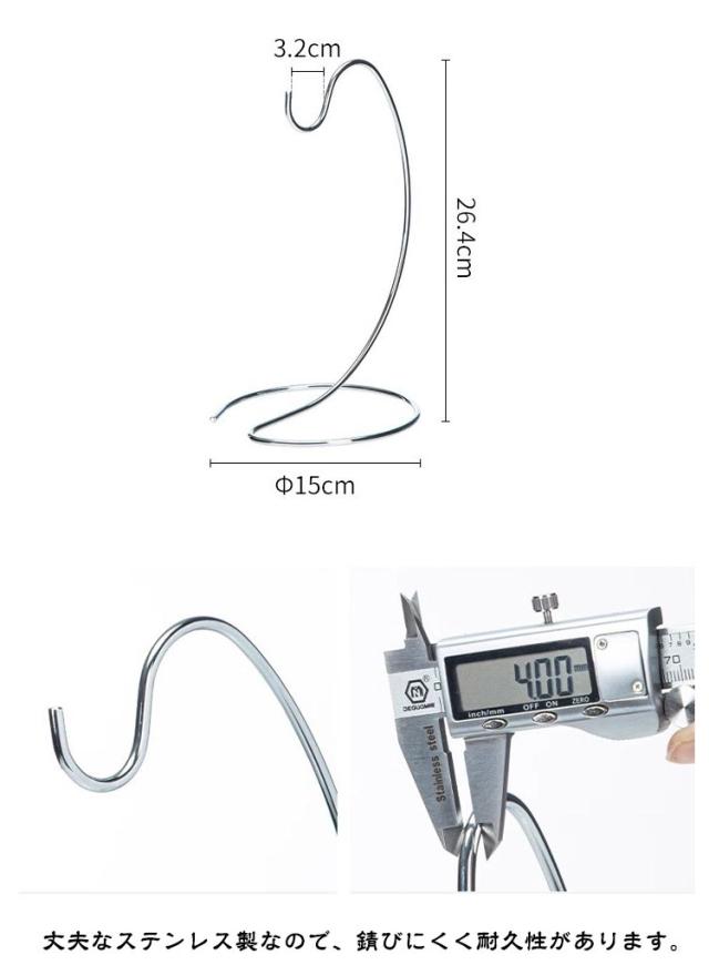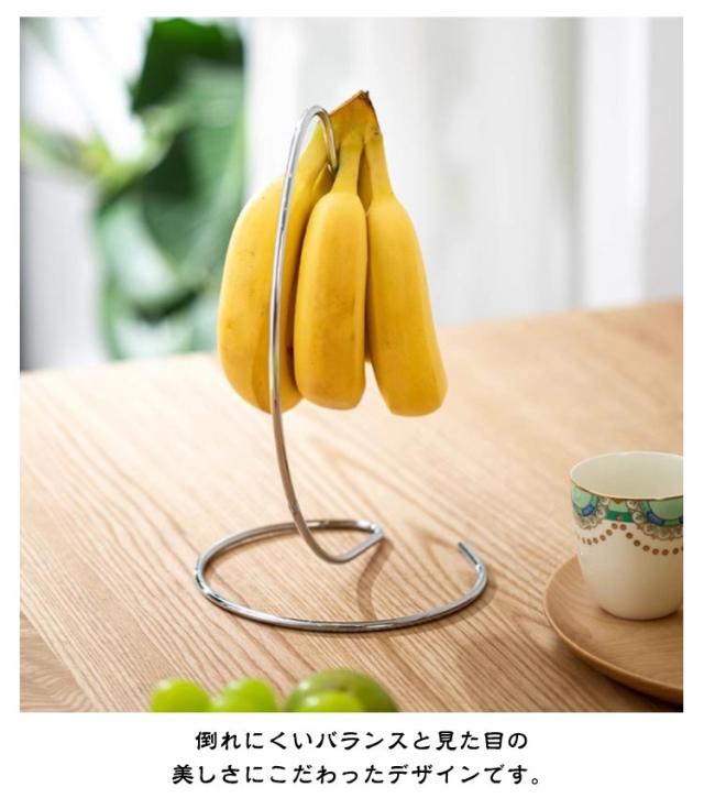 | シンプルなステンレス製ワイヤータイプのバナナスタンドです。 バナナを長持ちさせるのに効果的な吊るす保存方法により、新鮮なまま、美しく食卓を彩ります。 房の付いたバナナをそのままフックに掛けて吊るします。 倒れにくいバランスと見た目の美しさにこだわったデザインです。 丈夫なステンレス製なので、錆びにくく耐久性があります。 継ぎ目のない線材だけで作られているので、汚れがつきにくく衛生的です。 ヘッドホンやマスクなど、様々な小物収納に。 | |
