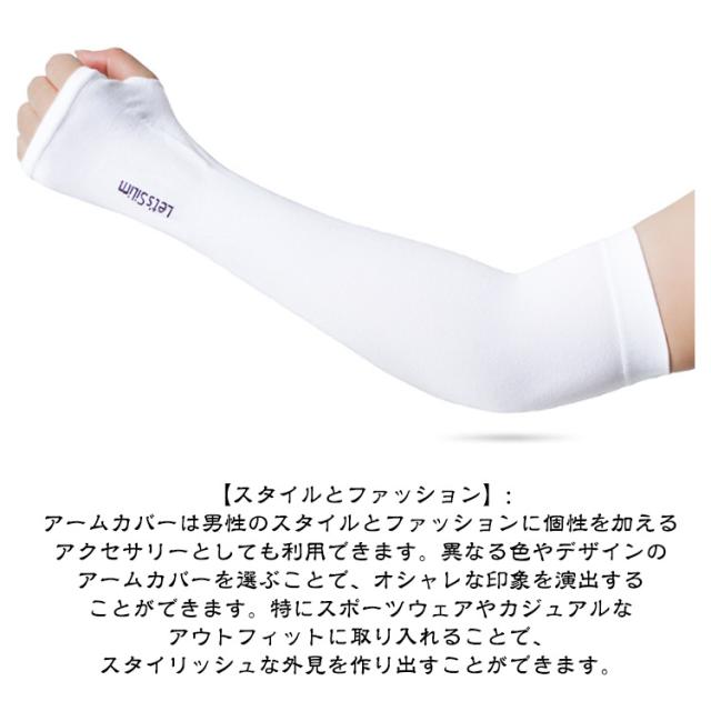 | ・【紫外線防止】: アームカバーは、男性の腕を紫外線から保護します。紫外線は肌の早期老化や日焼け、さらには皮膚がんのリスクを増加させる可能性があります。アームカバーを装着することで、日常の紫外線曝露を軽減し、健康な肌を保護することができます。 【温度調節】: アームカバーには冷感素材や吸湿速乾素材が使用されている場合があります。これにより、腕の汗を吸収し、気化させることで涼しさを感じることができます。特に暑い季節や運動中、アームカバーは快適な温度調節をサポートします。 【保護と防御】: アームカバーは、男性の腕を軽度な保護と防御から守ります。日常の擦過や軽い衝撃から肌を保護し、傷や刺青を視覚的にカバーすることができます。特にアウトドア活動やスポーツ時に、アームカバーは有用な保護具となります。 【スポーツパフォーマンス向上】: アームカバーは、スポーツやフィットネスのパフォーマンス向上にも役立ちます。筋肉のサポートと圧縮効果を提供し、疲労や筋肉の振動を軽減します。これにより、パフォーマンスの向上や怪我の予防に貢献します。 【スタイルとファッション】: アームカバーは男性のスタイルとファッションに個性を加えるアクセサリーとしても利用できます。異なる色やデザインのアームカバーを選ぶことで、オシャレな印象を演出することができます。特にスポーツウェアやカジュアルなアウトフィットに取り入れることで、スタイリッシュな外見を作り出すことができます。 | |