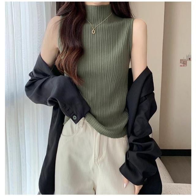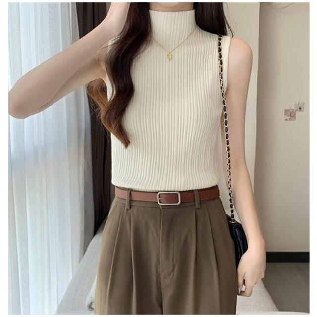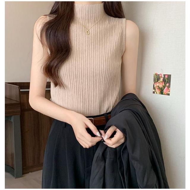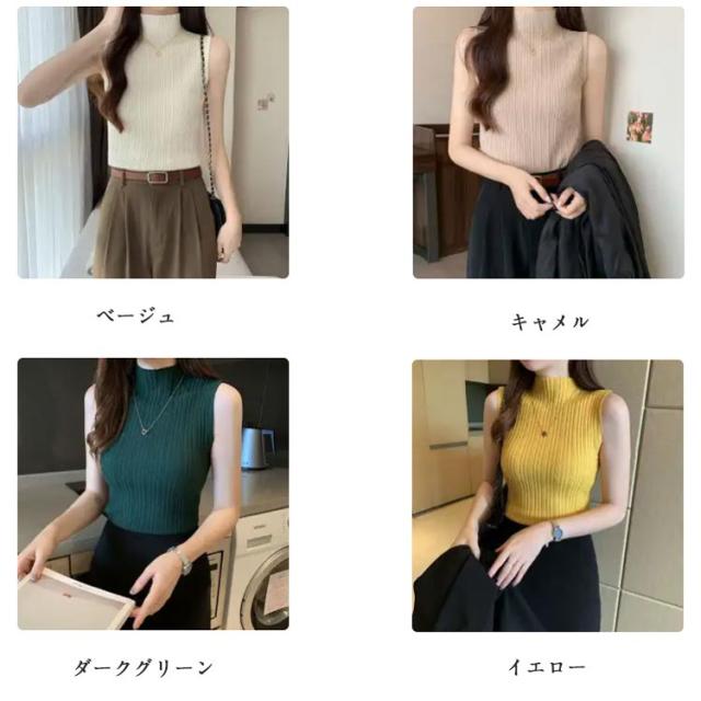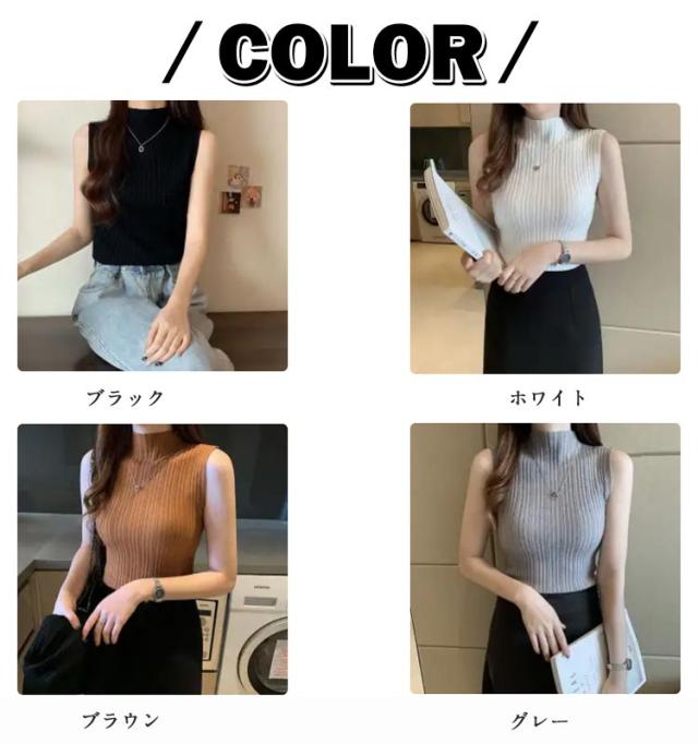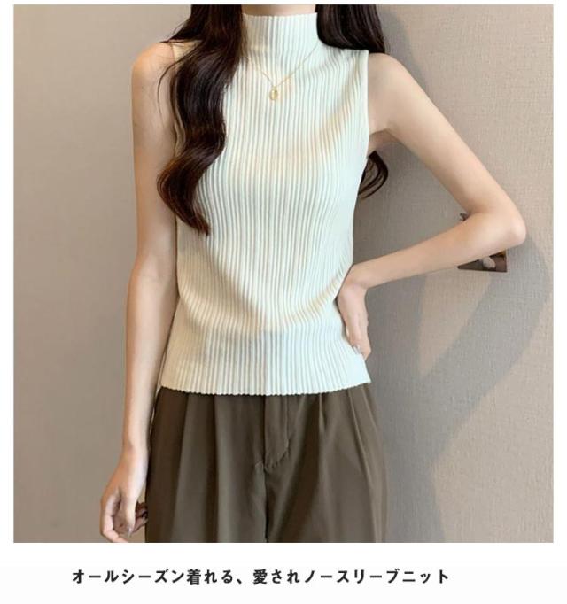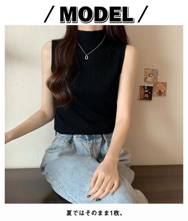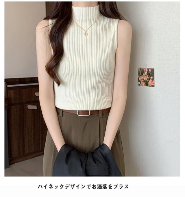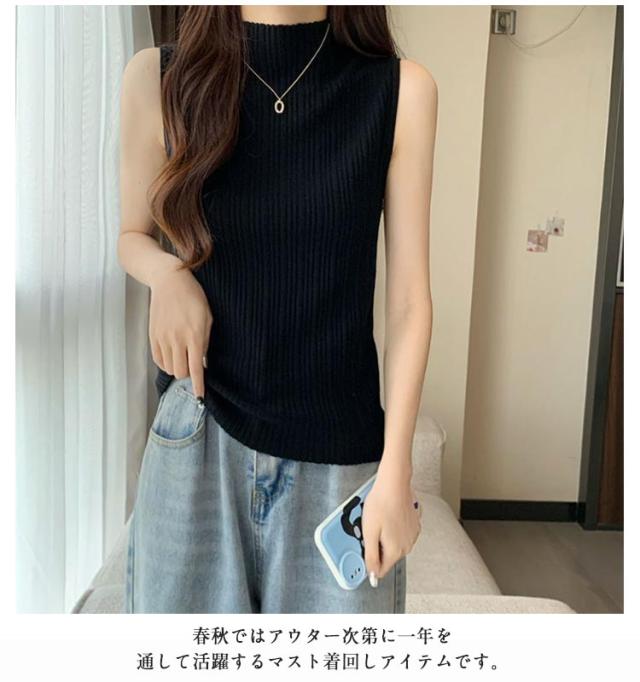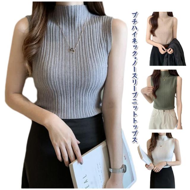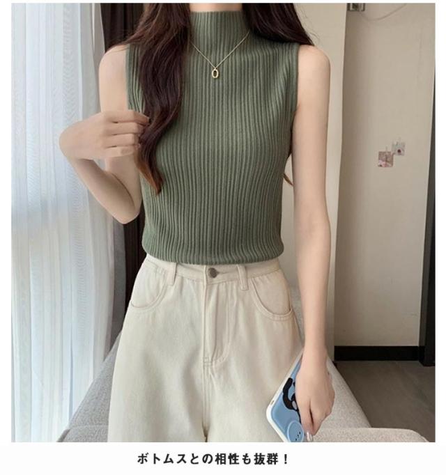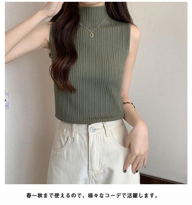 ハイネック ノースリーブニット サマーニット タンクトップ レディース トップス リブ編み 春ニット 夏ニット シンプル ニットベスト セクシー タイト インナーニット プチハイネック 無地 タンクトップ