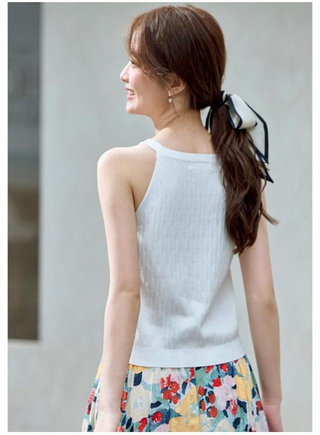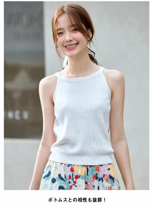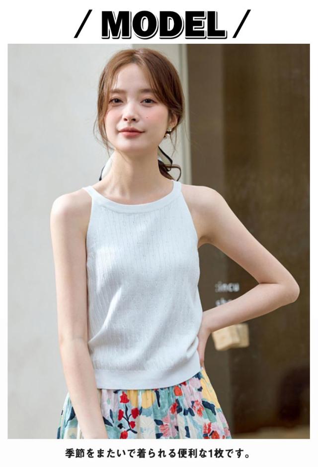 | シンプルなノースリーブニットはそのまま着てもインナーとして着てもOK 季節をまたいで着られる便利な1枚です。 オールシーズン着れる、愛されノースリーブニット やさしい手触りとふんわり勘、着心地の良いきじです。 ホルターネックデザインでお洒落をプラス 春〜秋まで使えるので、様々なコーデで活躍します。 ボトムスとの相性も抜群! | |
