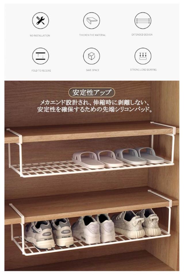 | 下駄箱の棚下に取り付ける 折りたたみ可能シューズラック 【玄関をフル活用】 下駄箱やシューズクロークの棚下に差し込むだけで、靴箱下の空間を有効活用できる 【安定性アップ】 メカエンド設計され、伸縮時に剥離しない、安定性を確保するための先端シリコンパッド 【伸縮式】 下駄箱などの棚下に取り付けて、デッドスペ-スを収納として有効活用。横幅は約40~77cm(最大65cmを推奨しています)の間で自由に伸縮できるので、高さは10cmまで棚に合わせてひったりのサイズで使えます。 【高品質素材】 厚い素材 耐久性があり傷がつきにくい | |