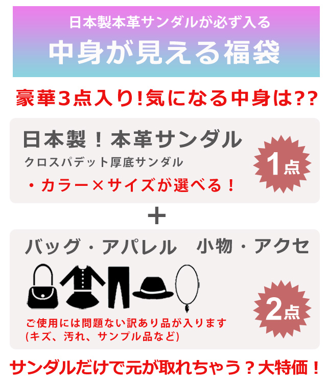 全品送料無料一部除く 2025 夏福袋 日本製本革サンダルが必ず入る福袋 レディース 送料無料 【即納】 中身が見える クロスパデット サンダル入 日本製 本革 訳あり お試し ファッション アパレル