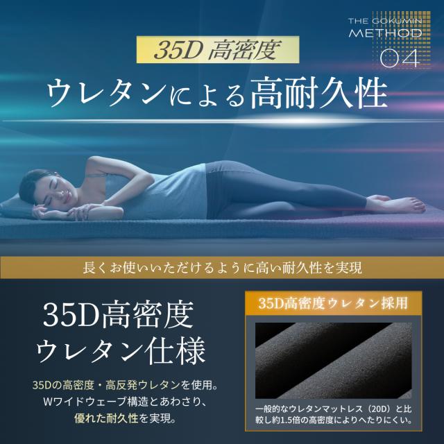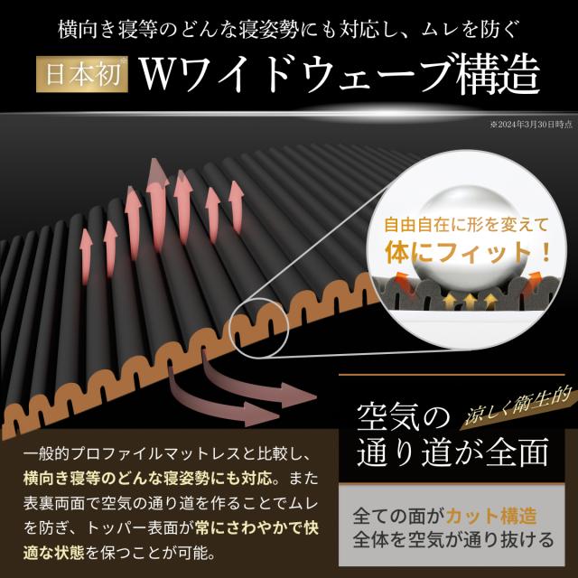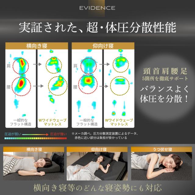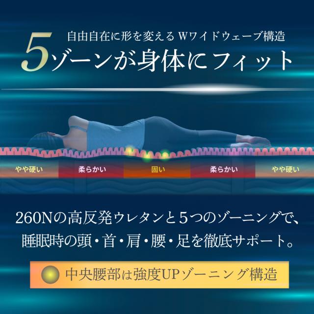 新発想の高反発、5つの特殊ゾーニング設計により身体の部位に合わせた理想の寝姿勢へ導きます。高密度(35D)素材による高い質感と耐久性。日本初「Wワイドウェーブ」構造でどんな寝姿勢でも優れた体圧分散性を実現。やや固めの寝心地で腰にお悩みの方も安心。