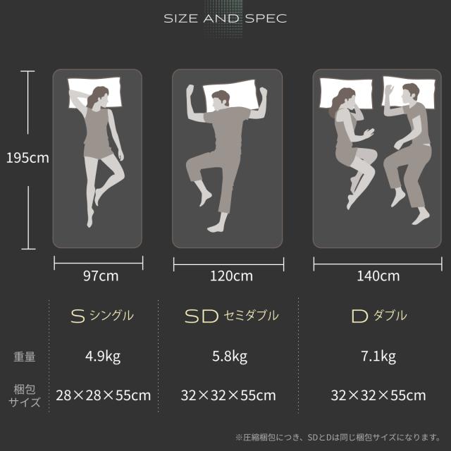 | サイズ・重量 | ・製品サイズ:約97cm×195cm×5cm ・製品重量:約4.9kg ・梱包サイズ:28×28×55cm |
