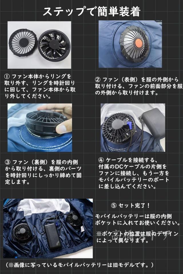 作業服のファンは3枚の大面積羽根を採用して、風がより強くなるので快適に過ごせます。接続ケーブルで強、中、弱の3段階風量を調整できます。