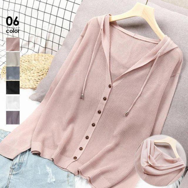 カーディガン レディース 春 薄手 フード付き 長袖 ニット 羽織り トップス 冷房対策 紫外線対策 夏 フェミニン カジュアル 無地 白 黒 くすみカラー