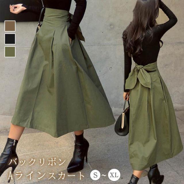 Aライン スカート マキシスカート レディース フレア 体型カバー オフィス 通勤 バックリボン 普段着 おしゃれ カジュアル フェミニン ゆったり 春 夏