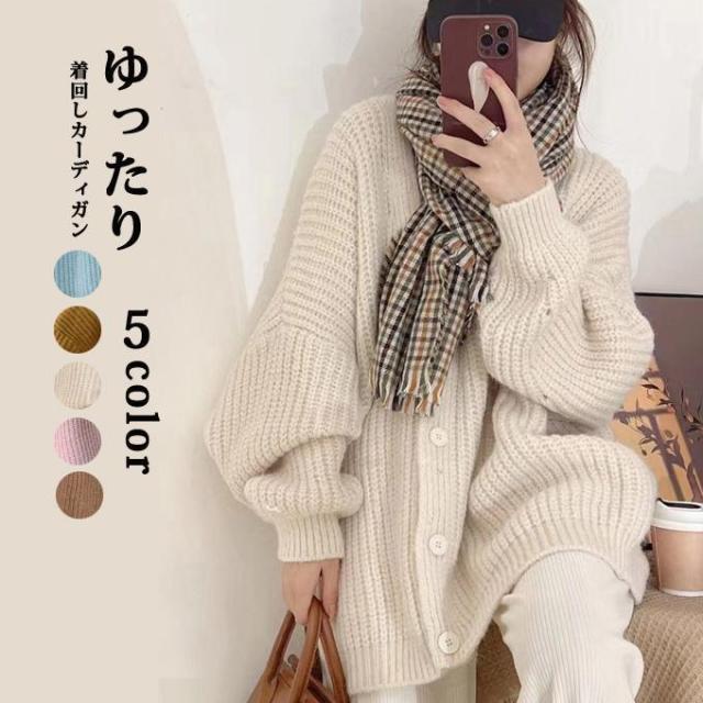 ニットカーディガン レディース 長袖 アウター ミドル丈 セーター パフスリーブ 無地 Vネック シングル 前開き ゆったり 通勤 通学 オフィス きれいめ 大人