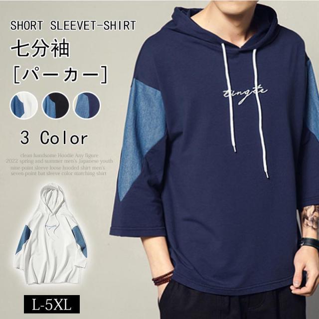パーカー 七分袖 配色 メンズ ルーズ ゆったり ビッグシルエット 夏パーカー スポーツ 切り替え 半袖 7分袖 おしゃれ フード付きパーカー ルームウェア 夏物