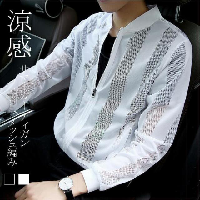 サマーカーディガン メンズ ストライプ 切り替え ライトアウター 夏 春 薄い 薄手 冷感 涼しい 日焼け対策 冷房対策 UV対策 ジャケット ブルゾン アウター 長袖 メッシュ編み カジュアル おしゃれ
