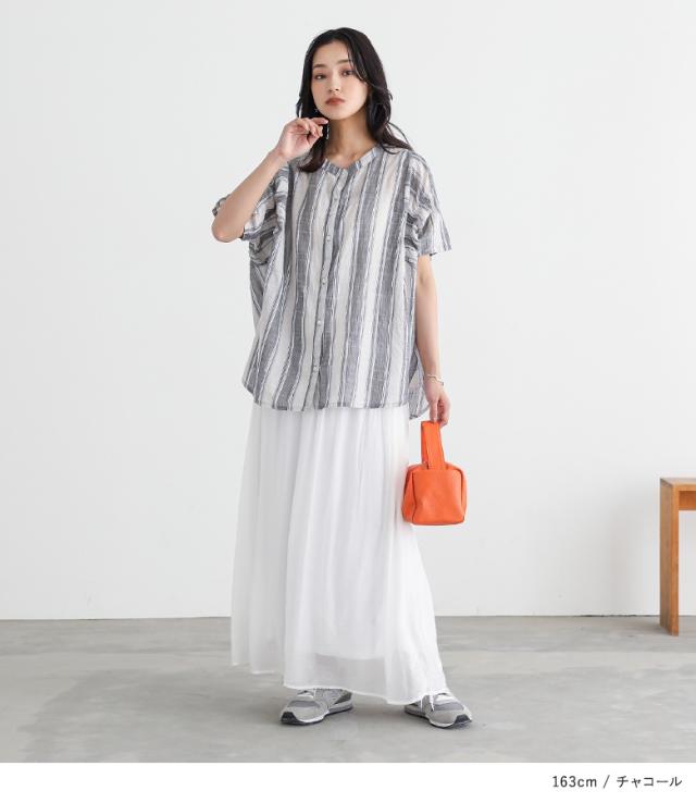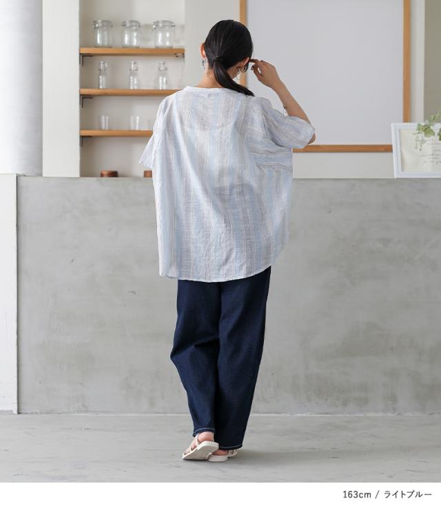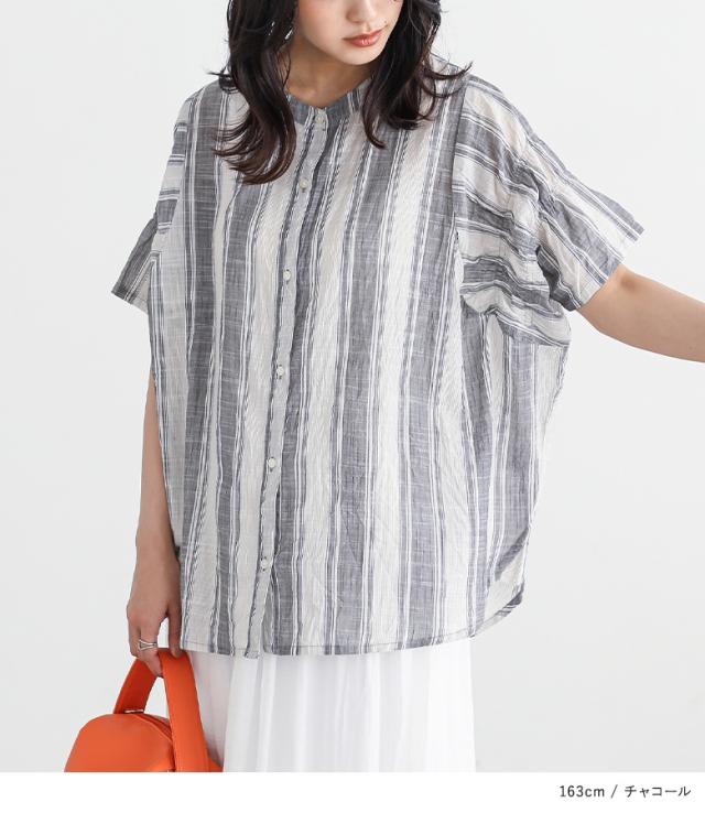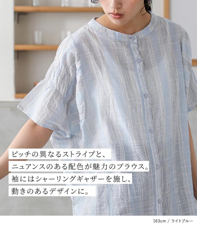 『ストライプ袖ギャザーブラウス』※メール便可※【10】[ブラウス 半袖 五分袖 レディース トップス シャツ バンドカラー ストライプ柄 インド綿 薄手 ギャザー 体型カバー カジュアル ナチュラル 春 夏]