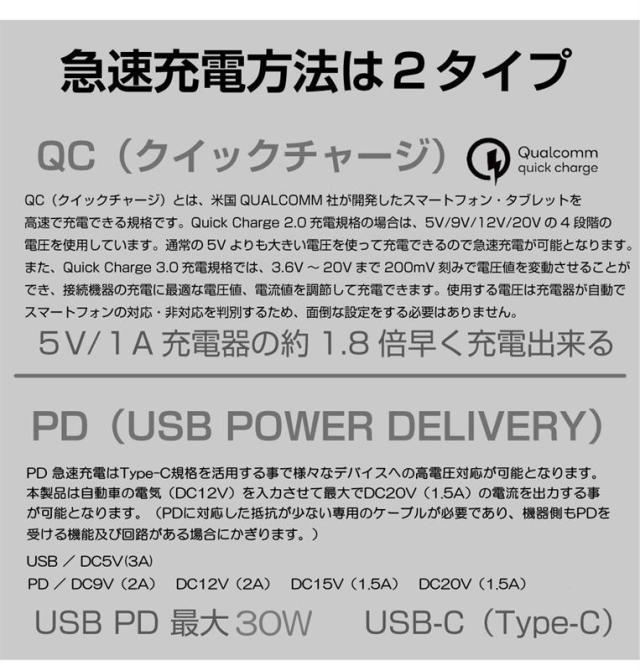 Type-C PD(パワーデリバリー) Type-A QC3.0(クイックチャージ) |