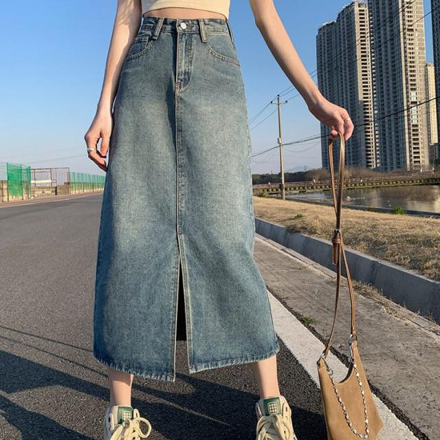 スリット入りで動きやすいシンプルなデニムスカート。