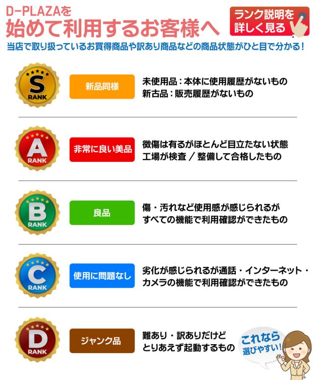 当店では、『リユースモバイルガイドライン』に準拠して、商品の状態や入荷前の使用用途などから 「S品」「A品」「B品」「C品」「D品」の5段階でランク付けをしています。(*本体のみの状態を基準にしたランク付けになります。)