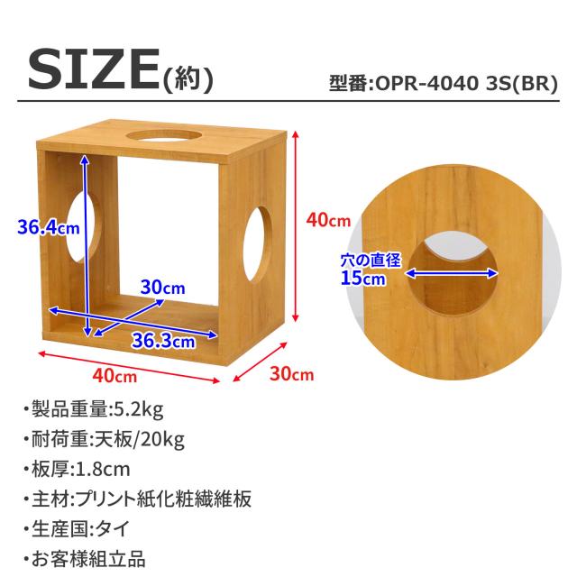 ・製品サイズ(約):幅40×奥行30×高さ40cm ・穴の直径(約):15cm ・内寸(約):幅36.3×高さ36.4cm ・製品重量(約):5.2kg ・耐荷重(約):天板/20kg ・主材:プリント紙化粧繊維板 ・生産国:タイ ・お客様組立品 ※モニターの発色具合により、実際の色と異なる場合がございます。 |