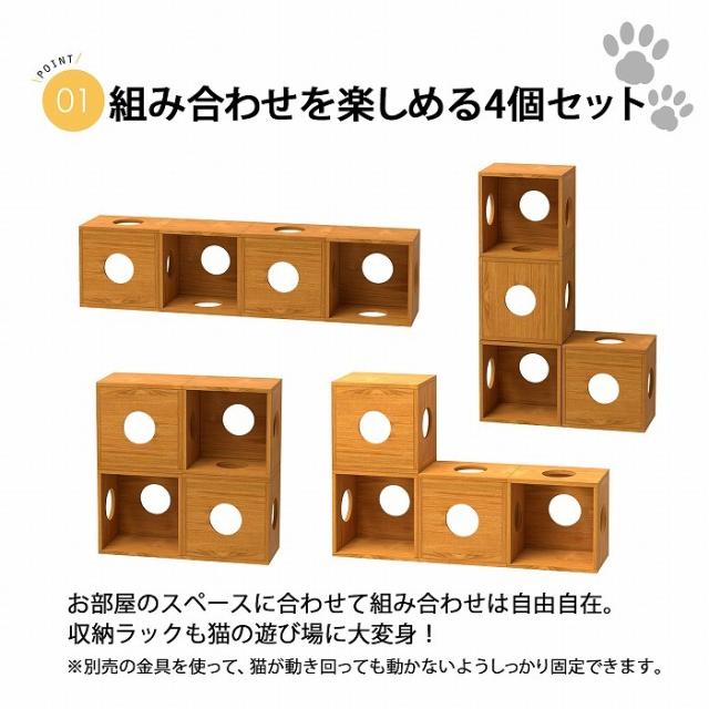 猫 家具 棚 猫用キューブボックス 4穴 幅40cm 奥行30cm 高さ40cm 4個セット 組み合わせてキャットタワー 猫タワー 猫用アスレチック 猫ハウス 猫ホーム キャットハウス 猫グッズ カラーボックス 直径15cmの穴あき型オープンラック A4対応 木製 国産シート 日本製シート使用