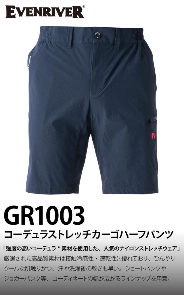 2025年新商品 EVENRIVER イーブンリバー コーデュラ ストレッチカーゴハーフパンツ GR1003メンズ 男性用 作業用半ズボン 仕事着 春夏用 接触冷感 速乾性 CORDURA