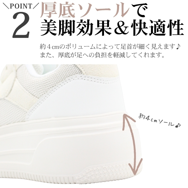約4cmのボリュームによって足首が細く見えます♪また、厚底が足への負担を軽減してくれます。