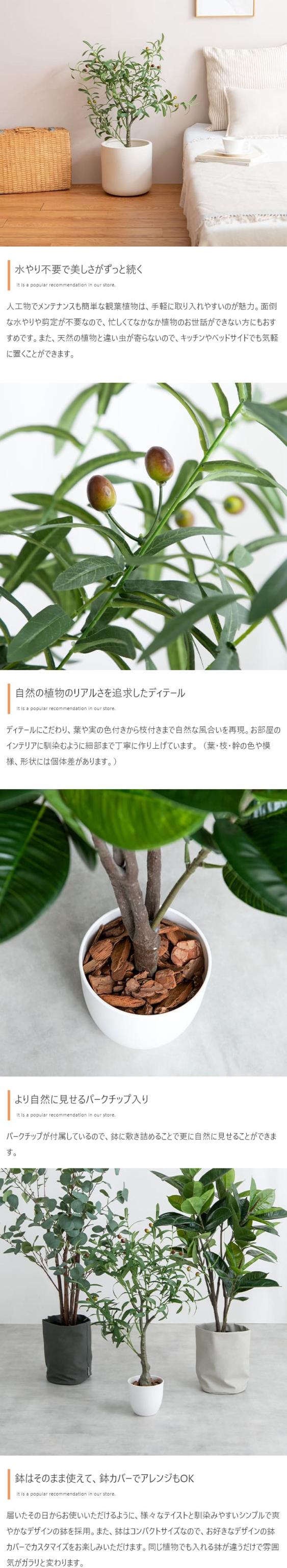 人工物でメンテナンスも簡単な観葉植物は、手軽に取り入れやすいのが魅力。面倒な水やりや剪定が不要なので、忙しくてなかなか植物のお世話ができない方にもおすすめです。また、ディテールにこだわり、葉や実の色付きから枝付きまで自然な風合いを再現。