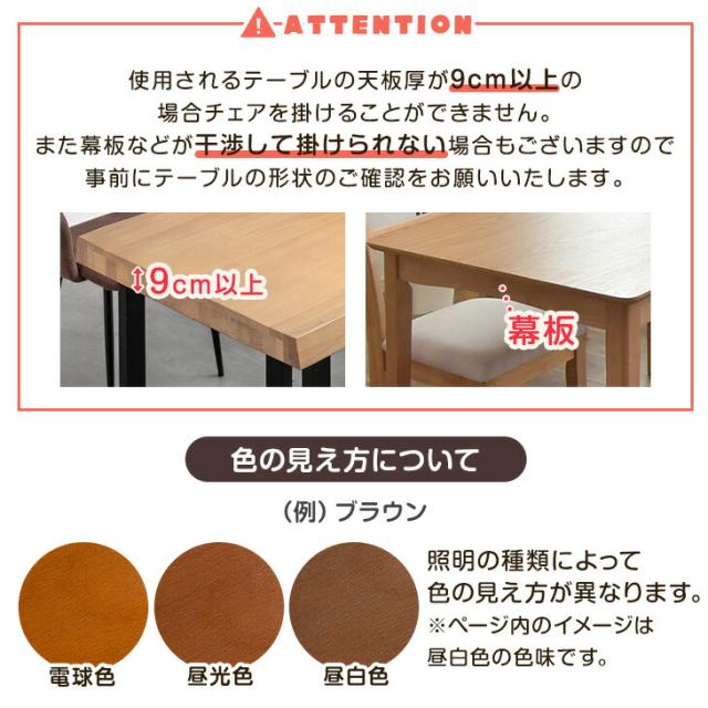 ※使用されるテーブル/デスクの天板厚が9cm以上の場合チェアを掛けることができません。また幕板などが干渉して掛けられない場合もございますので、事前にテーブルの形状のご確認をお願いいたします。