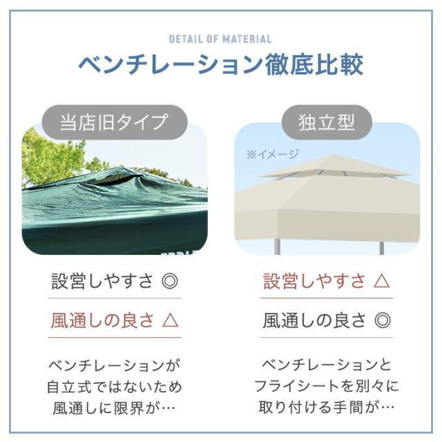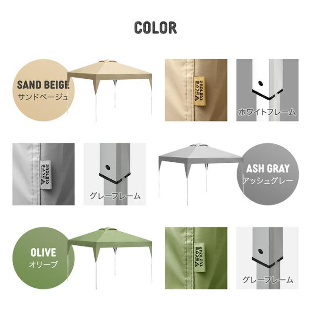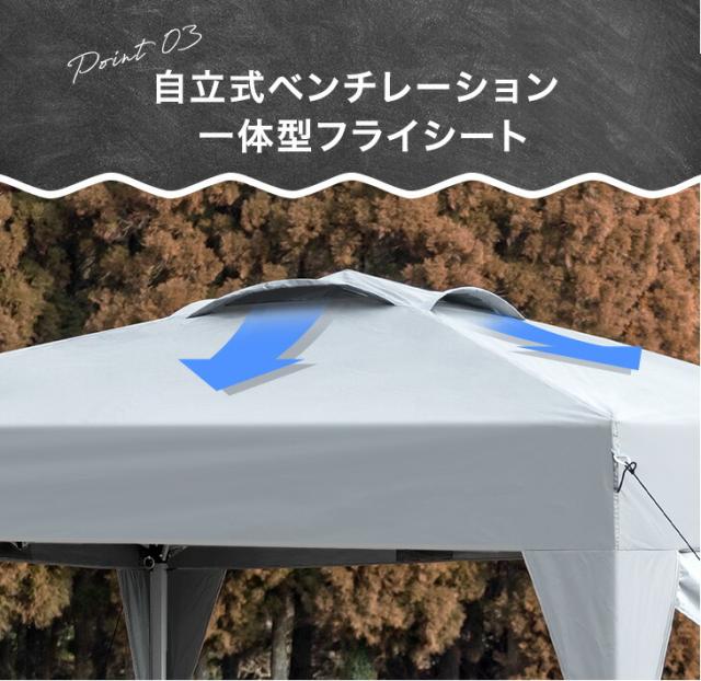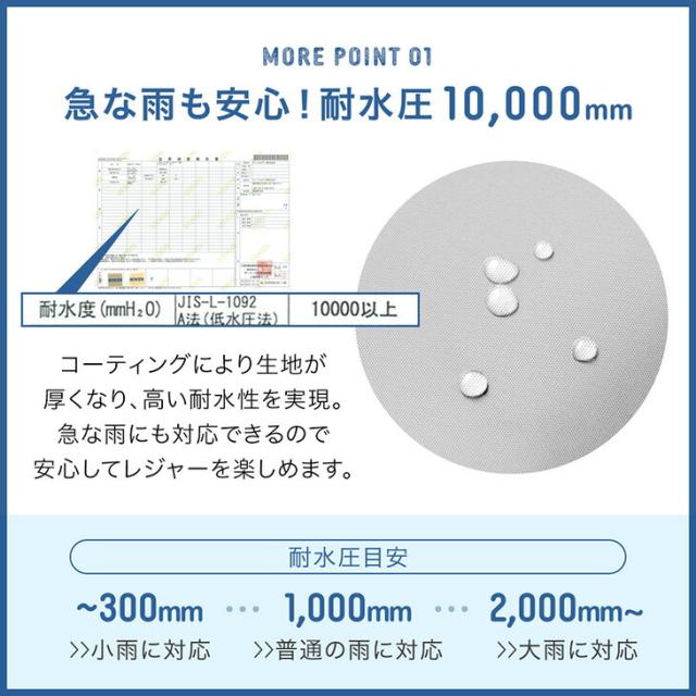 ※タープの耐水加工は雨天・豪雨でのご使用を保障するものではありません。悪天候時の使用はお控えください。また頂点部にベンチレーションを持ち、側面がオープンとなっているタープの構造上、完全に雨が防げないことを理由とした返品交換はお受付できません。予めご了承ください。