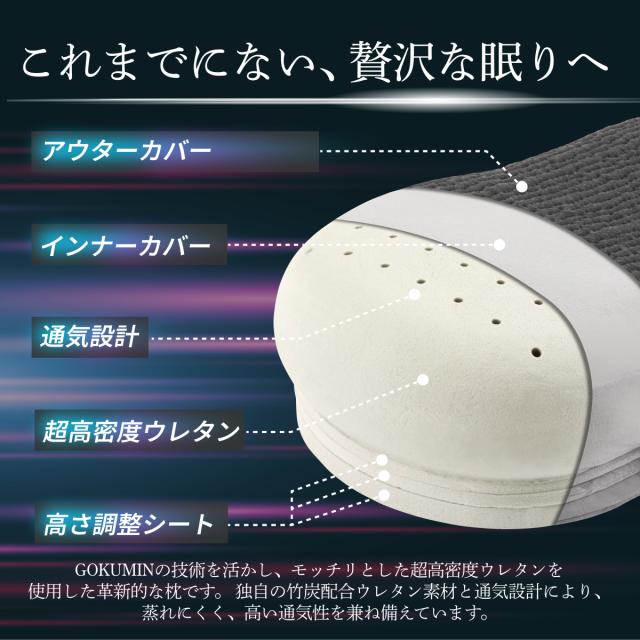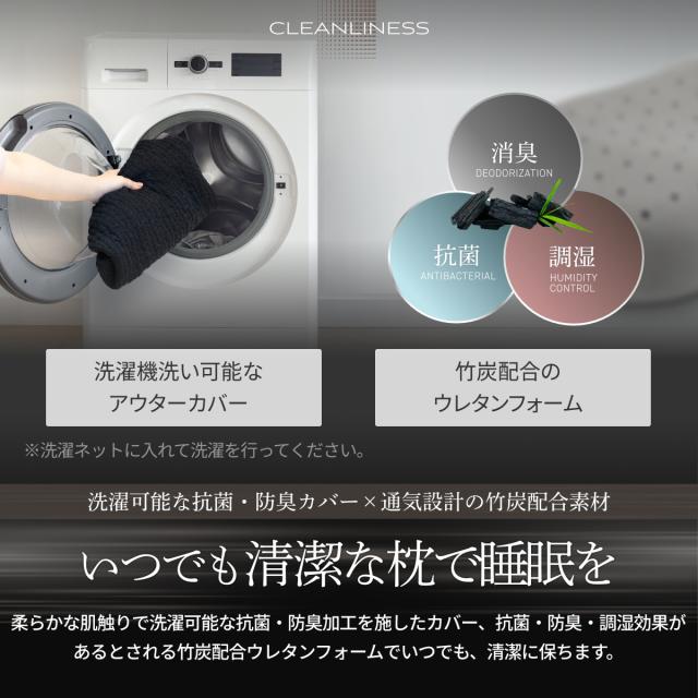 超高密度75D×竹炭配合×通気設計で実現した『極・低反発枕』。もちっと感触とムレにくい通気設計にこだわりました。さらに抗菌・防臭・調湿効果のある竹炭を配合。極上の低反発で頭部と頸椎を優しく包み込み、快適な睡眠を提供します。