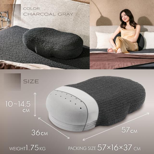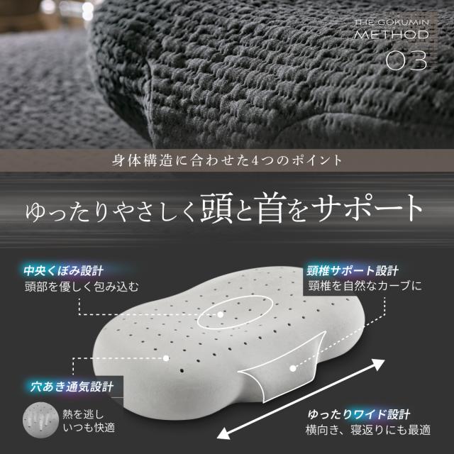くぼみ設計で頭部を優しく包み込み、頸椎サポート設計で首を自然なカーブに。幅57cmとゆったりワイド設計でラクラク寝返り。どんな寝姿勢でも安定した睡眠ができます。