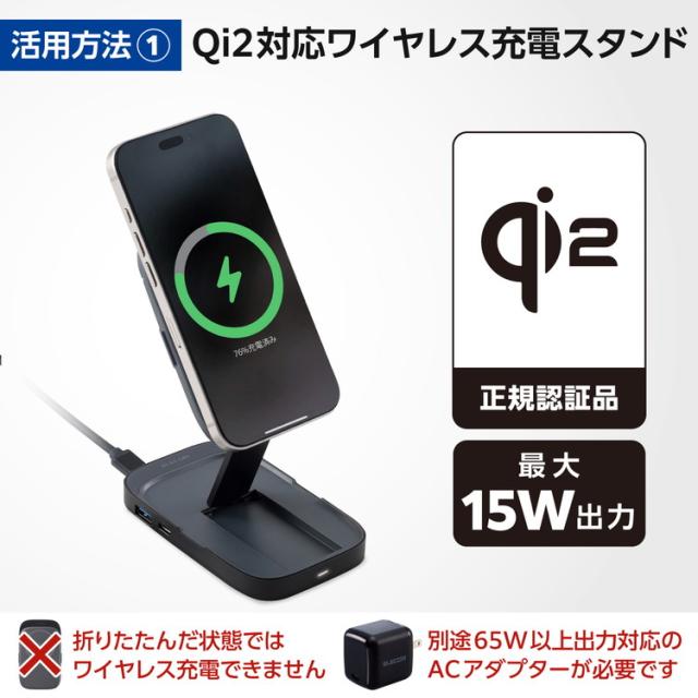 ■Qi2対応ワイヤレス充電スタンドを付属した、4in1ドッキングステーションです。スマートフォンのワイヤレス充電・周辺機器の接続を1台にまとめられます。