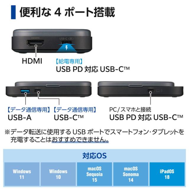 ■対応OS(Windows):Windows 11/10 ■対応OS(macOS):macOS Sequoia15/macOS Sonoma 14 ■対応OS(iPadOS):iPadOS 18/17 ■対応OS 備考:※各OSの最新バージョンへのアップデートや、サービスパックのインストールが必要になる場合があります。 ■コネクター仕様(アップストリーム):USB Type-C(TM)ポート<USB 10Gbps(USB3.2(Gen2))>、USB Power Delivery対応(最大入力100W / 最大出力85W)、DisplayPort(TM) Alt mode (USB2.0接続時はUSB2.0互換で動作(USB2.0時は映像出力非対応)) ■USBポート(ダウンストリーム)(1):1:USB Type-Cポート<USB 10Gbps(USB3.2(Gen2))>×1 ※データ通信専用です。映像出力には対応していません。 ■USBポート(ダウンストリーム)(2):2:USB Type-Cポート<入力65W〜100W>×1 ※充電専用USB Power Deliveryポート ■USBポート(ダウンストリーム)(3):3:USB-Aポート<USB 10Gbps(USB3.2(Gen2))>×1 ※データ通信専用です。 ■USBポート(ダウンストリーム)(4):※USBの各ポートを使用してスマートフォン・タブレットを充電することはおすすめできません。 ■映像出力ポート(ダウンストリーム):HDMI(R)×1<対応解像度:最大4K/60Hz> ■ワイヤレス充電出力:Qi2:5W/7.5W/15W ■電源方式:バスパワー ■外形寸法:折りたたみ時:幅約73mm×奥行約118mm×高さ約21mm、使用時:幅約73mm×奥行約118mm×高さ約160mm(高さは最大値) ■カラー:グレー ■内容物:USB Type-Cケーブル(規格:USB 10Gbps、 約16cm ※コネクター含まず) ■動作環境:温度5〜40℃、湿度30〜80% ※結露なきこと ■保証期間:1年間