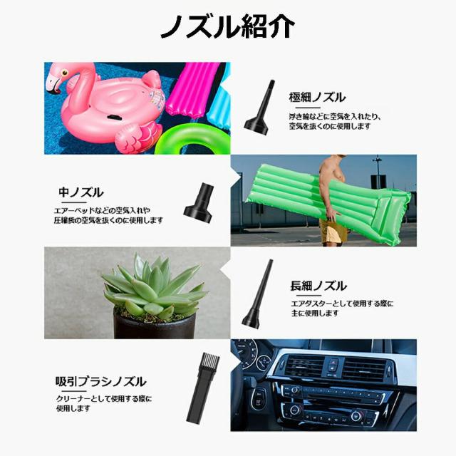 「コンピューター基板、キーボード、窓シャッター、エアコン、プリント回路基板、電子機器、フィルター、隅のホコリ等のクリーニング」、「エアベッド、浮き輪、風船の充填」、「炭燃やしの風送り」等様々なシーンに活躍しています。