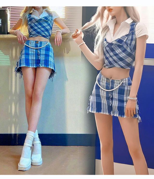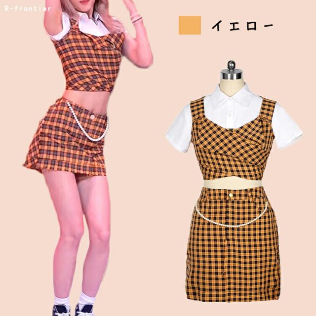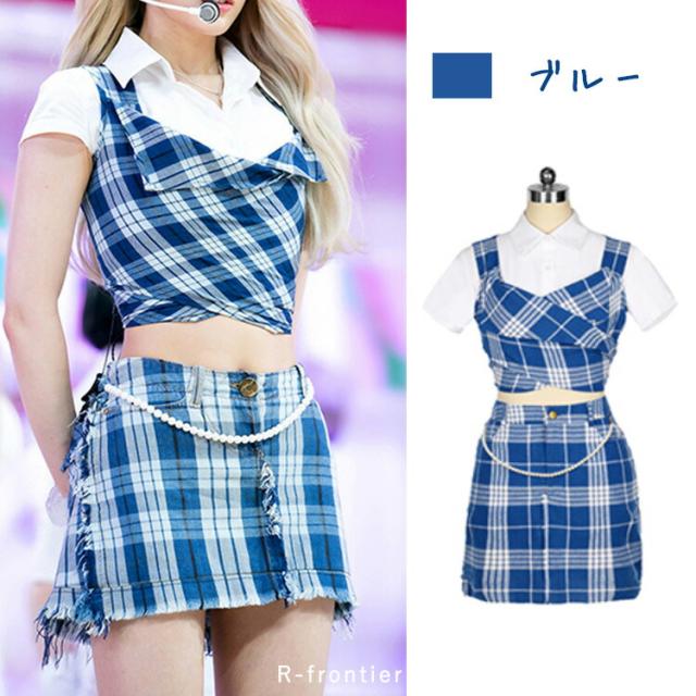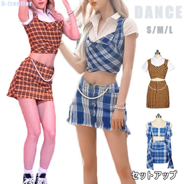 k-pop 衣装 大人 衣装 レディース K-POP イベント衣装 ダンス衣装 セットアップ へそ出し チェック柄 格子柄 ブルー イエロー セクシー 韓国 ダンス 衣装 細身 ステージ衣装
