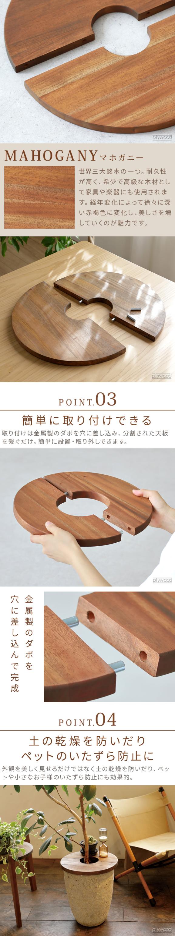 お部屋のプランターをお洒落な木製テーブルに変えてしまう、ユニークでスタイリッシュなプランツテーブル。天然木のマホガニーを使用しています。お部屋の端に置きがちな高さのある植物も、プランツテーブルを使用すればリビングの真ん中にレイアウト可能。鉢をカバーすることで、土の乾燥を防いだり、ペットや小さなお子様等のいたずら防止にも。玄関先やキッチン、リビングや寝室など様々なシーンでお使い頂けます。