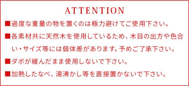 | 植木鉢は別売りです。 過度な重量の物を置くのは極力避けてご使用下さい。 各素材共に、天然木を使用しているため、木目の出方や色合い・サイズ等には個体差があります。予めご了承下さい。 本来の目的以外に使用しないで下さい。 ダボが緩んだまま使用しないで下さい。 加熱したなべ、湯沸かし等を直接置かないで下さい。 製品の分解や改造をされると故障の原因となりますので絶対にやめて下さい。 業務用では使用しないで下さい。 |
