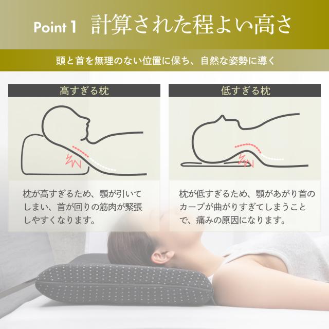 異素材で快適な睡眠を叶える高密度で高耐久。理想の寝姿勢に追求した「高さ」、どの面からも実現している絶妙なカーブ設計により、頸椎が自然な状態でキープすることができます。