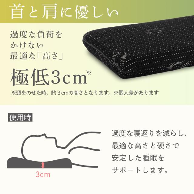 頭をのせたときの高さは約3cmと低め、頭と首を無理のない位置に保つことができます。異素材で実現した程よい反発力、首や肩に負担をかけずスムーズに寝返りすることができます。