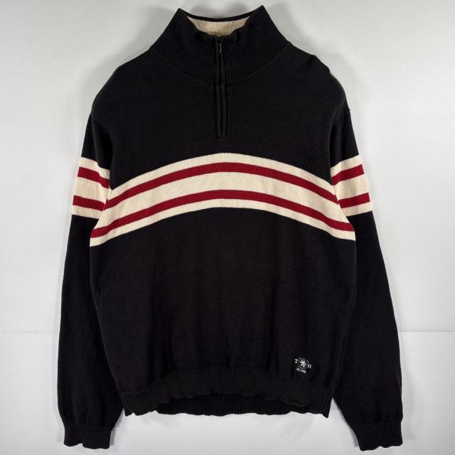 古着 トミーヒルフィガー TOMMY HILFIGER コットンニットセーター ハーフジップ ボーダー リブ襟 大きいサイズ XXL ブラック メンズ