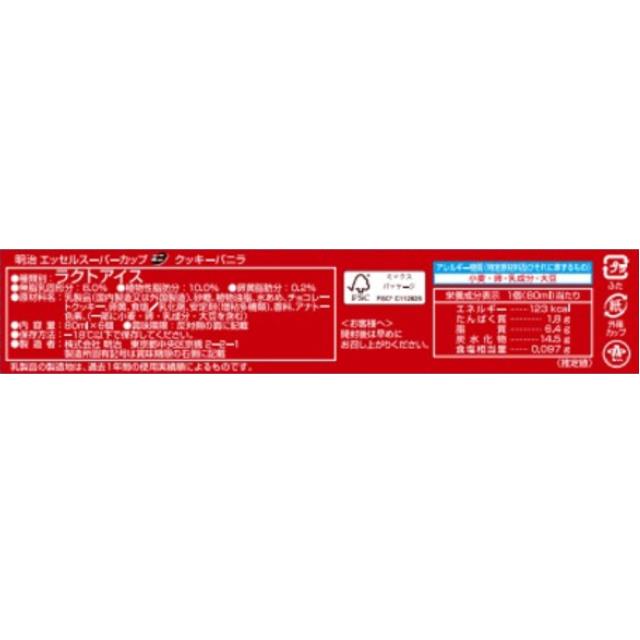 商品名 [アイス] 明治 エッセル スーパーカップ ミニ クッキーバニラ 480ml×8個 容量 480ml×8個 原材料名 乳製品(国内製造又は外国製造)、砂糖、植物油脂、水あめ、チョコレートクッキー、卵黄、食塩/乳化剤、安定剤(増粘多糖類)、香料、アナトー色素、(一部に小麦、卵、乳成分、大豆を含む) アレルギー特定原材料 小麦、乳、卵 賞味期限 商品の発送時点で、60日以上あるものをお届けいたします 保存方法 -18℃以下で保存してください。