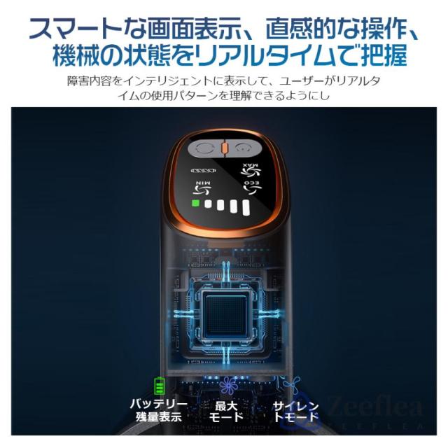 LCDディスプレイを搭載し、吸引力のレベルやバッテリー残量、充電状況、異常状態などを一目で確認できます。スマートなディスプレイにより、最適なタイミングで充電やメンテナンスが行えます。バッテリーが減ってきた時も、ディスプレイを見ればすぐに分かり、予期せぬ電池切れの心配が軽減されます。リアルタイムで掃除機の状態を把握できるこの機能は、より効率的な掃除をサポート。吸引力の調整も簡単に行え、使用シーンに応じた最適な設定が可能。