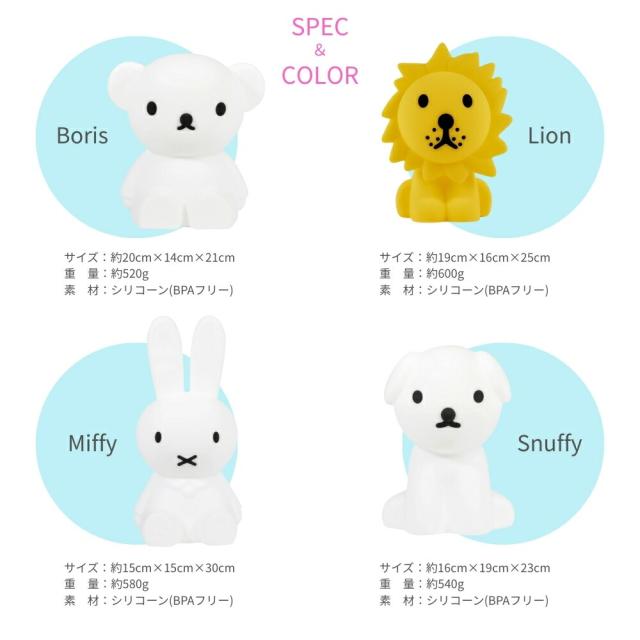 | 商品名: Mr Maria ミッフィー ファーストライト Miffy MM-007 ナイトライト ライト 間接照明 授乳ライト LED シリコン キャラクター照明 -商品説明- FIRST LIGHT miffy and friends 授乳タイムにもうれしい!ミッフィーや仲間たちが柔らかく優しく照らしてくれる充電式ライト。 ☆ずっとそばで見守ってくれるライト☆ 夜の深さをも明るく照らしてくれて、やわらかな明かりで私たちをホッとさせてくれる。 ☆持ち運べるから使い方もさまざま☆ シンプルなデザインはお子さまだけでなく、大人のインテリアにもなじみます。間接照明としてはもちろん、ベットサイドに置いてナイトライトとしても活躍してくれる。 6段階で調光ができるから小さなお子様をお持ちのママへ夜間のおむつ替えや授乳時の明かりにおすすめ。調節できる優しい明かりで赤ちゃんにもママにもうれしい照明です。 ☆やわらかいシリコーン製のLEDライト☆ BPAフリーのやわらかいソフトシリコーン製なので、小さなお子さまにも安心してお使い頂けます。 シリコーン製の本体部分は中性洗剤で水洗いすることができます。また、光源にはLEDを使用しており触れても熱くないのも安心なポイントの一つです。 ☆ミッフィーの仲間たち☆ Boris… 頼りになる友人ボリスは、暗闇も心強く照らしてくれる。 人気の高いくまのボリスは男の子への贈りものにもぴったりです。 Lion… 可愛すぎず、デザイン感のあるシンプルさで大人のファンも多いライオン。 ライオンの鮮やかなイエローをそのまま表現しています。 Snuffy… 好奇心旺盛なスナッフィーと夜を越える冒険へ。 ミッフィーの絵本でもお馴染みのスナッフィー。 ☆ディック・ブルーナ氏の世界観あふれるパッケージでギフトに☆ 授乳ライトとしても使える実用性、お子様の部屋のインテリアにも、大人のインテリアも邪魔することがないシンプルなデザイン。 防災や防犯対策にも選ばれ、世代を問わず愛されるシンプルな照明です。 ディック・ブルーナ—氏のイラストと絵本でお馴染みのブルーナカラーを基調にしたパッケージも素敵。 ※予告なく、パッケージデザインが変更となる場合がございます。ご了承ください。 -仕様- ・サイズ・カラー Miffy:W15cm × D15cm × H30cm Boris:W20cm x D14cm x H21cm Lion:W19cm x D16cm x H25cm Snuffy:W16cm x D19cm x H23cm ・パッケージサイズ:W19cm × D18.5cm × H30cm ・素材:ソフトシリコーン(BPAフリー) ・電源:充電式LEDモジュール(リチウムイオン電池内臓) ※お届け時には充電がされていません。 ※防水仕様ではありません。 ・その他:6段階調光、フル充電後8~120時間(使用環境や調光度により異なります) ・付属品:USB type-Cケーブル ※ACアダプタは付属いたしません。 ・原産国:中国 -注意事項- ・商品の色はできる限り実物に近づけていますが、ディスプレイ設定や撮影条件により色味が異なる場合があります。ご了承ください。 ・ご注文のタイミングや内容により、購入後のキャンセルや修正が制限される場合があります。 ・同時に複数のご注文があった場合、システム上の遅延により在庫がないにも関わらず購入できてしまう場合があります。そのような場合は速やかにメールでお知らせいたします。 |
