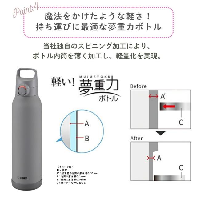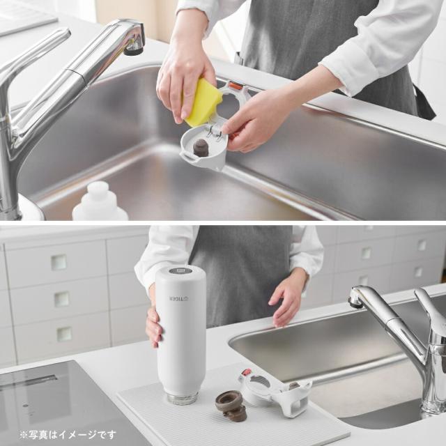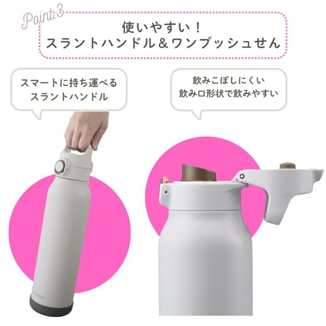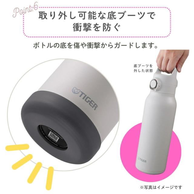| 商品名: タイガー魔法瓶 真空断熱ボトル 水筒 1.5L MTA-H150 スポーツドリンク対応 保冷 ワンタッチ 直飲み ダイレクト 大容量 スポーツ ジム 運動 部活 子供 大人 軽量 スラントハンドル パッキン一体型せん ステンレス製 底カバー付き -商品説明- 真空断熱ボトル MTA-H150 スポーツシーンにぴったり! らくらくキャップでお手入れ簡単な大容量保冷ボトル(水筒) スポーツシーンにぴったりな大容量の保冷ボトル 真空断熱構造による高い保冷力で、6時間後でも約7℃以下※1をキープ!スポーツドリンクを入れてもOK※2なので、長時間のスポーツシーンにぴったり。 お子さまはもちろん大人も使いやすいデザインの大容量保冷ボトルが登場。 ※1 保冷効力は、室温20度±2度において、製品に冷水を満たし、縦置きにした状態で水温が4度±1度の時から6時間放置した場合におけるその水の温度です。 ※2 使用後はすぐに水ですすぐなど、お手入れをしてください。 ----お手入れらくらく!---- 1.パッキン一体型せん「らくらくキャップ」 せんとパッキンが一体になった「らくらくキャップ」搭載。パッキン着脱の必要がなく、パッキンのつけ忘れやつけまちがい、紛失の心配もありません。外せる飲み口でしっかり洗えて衛生的。 2.汚れやにおいがつきにくく、サビにも強いスーパークリーンPlus(プラス) ボトルの内面には、なめらかで光沢のあるスーパークリーンPlusを施しました。汚れ・においがつきにくく、サビにも強いので塩分を含むスポーツドリンクを入れてもOK。 ※使用後はすぐに水ですすぐなど、お手入れしてください。 ----使いやすい!スラントハンドル&ワンプッシュせん---- スマートに持ち運べるスラントハンドル 飲みこぼしにくい飲み口形状で飲みやすいふたは、ワンプッシュで簡単にオープンするので、片手で操作して、すばやく水分補給することができます。 ----魔法をかけたような軽さ!持ち運びに最適な夢重力(むじゅうりょく)ボトル---- 当社独自のスピニング加工により、ボトル内筒を薄く加工し、軽量化を実現。 ----氷が入れやすい!広い口径---- 口径は約4.8cmあり、氷が入れやすい広口です。 ----使用シーンに合わせて選びたいカラーラインアップ---- 青空やマリンスポーツのシーンに合う鮮やかなカラーから、屋内のフィットネスシーンに合うモノトーンカラーまで。幅広いシーンに合わせて心地よく選べるカラーライアップ展開。 ----取り外し可能な底ブーツで衝撃を防ぐ---- ボトルの底を傷や衝撃からガードします。 -特徴・品質- ・真空断熱構造により保冷効力抜群(6時間で約7℃以下をキープ) ・ステンレス製でサビに強く、スポーツドリンクもOK ・らくらくキャップ(パッキン一体型)でお手入れ簡単&衛生的 ・スーパークリーンPlus加工でにおい・汚れがつきにくい ・夢重力(むじゅうりょく)設計で軽量ボディ(約530g) -仕様- ・メーカー型番:MTA-H150 ・カラー:ロータスピンク<PH>、ダブグレー<HH>、スモークホワイト<WH> ・容量:1.5L ・保冷効力(6時間):7℃以下 ・サイズ(約):幅9.1×奥行9.1×高さ36.4cm ・質量(約):0.530kg ・口径(約):4.8cm ・原産国:ベトナム -機能- ・スポーツドリンク対応(使用後はすぐにすすいでください) ・片手で開閉できるワンプッシュせんで素早く水分補給 ・飲みやすい飲み口形状でこぼれにくい設計 ・氷が入れやすい広口(口径約4.8cm) ・スマートに持ち運べるスラントハンドル付き ・取り外し可能な底カバーで衝撃や傷から保護 -使用・手入れについて- ・パッキン一体型キャップで部品の着脱が不要、つけ忘れや紛失の心配なし ・飲み口は取り外してしっかり洗浄可能で衛生的 ・スーパークリーンPlusで汚れやにおいが付きにくく、清潔に保てます ・底カバーも取り外して洗えるので、清掃が簡単です -注意事項- ・商品の色はできる限り実物に近づけていますが、ディスプレイ設定や撮影条件により色味が異なる場合があります。ご了承ください。 ・ご注文のタイミングや内容により、購入後のキャンセルや修正が制限される場合があります。 ・同時に複数のご注文があった場合、システム上の遅延により在庫がないにも関わらず購入できてしまう場合があります。そのような場合は速やかにメールでお知らせいたします。 |