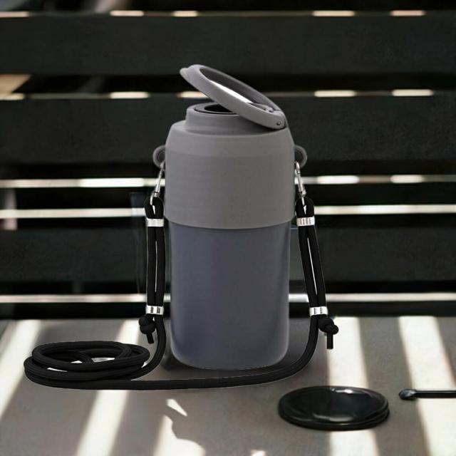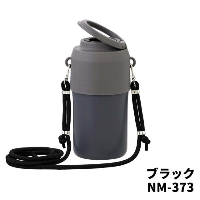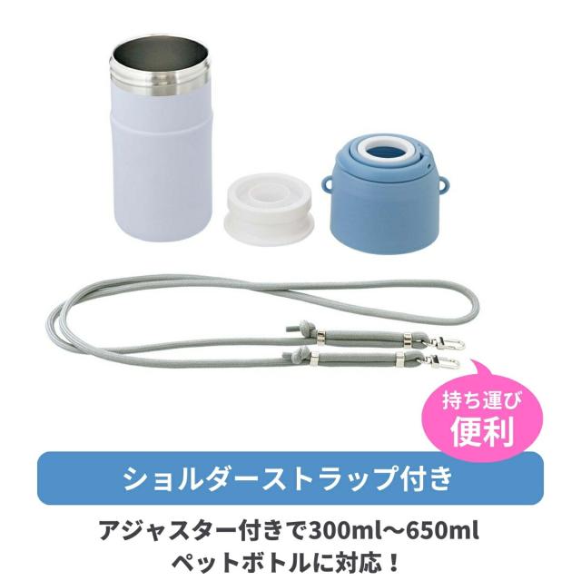 長さ調整できるショルダーストラップ付きで持ち運びに便利。高さ調整できるアジャスター付きで300ml〜650mlのペットボトルに対応